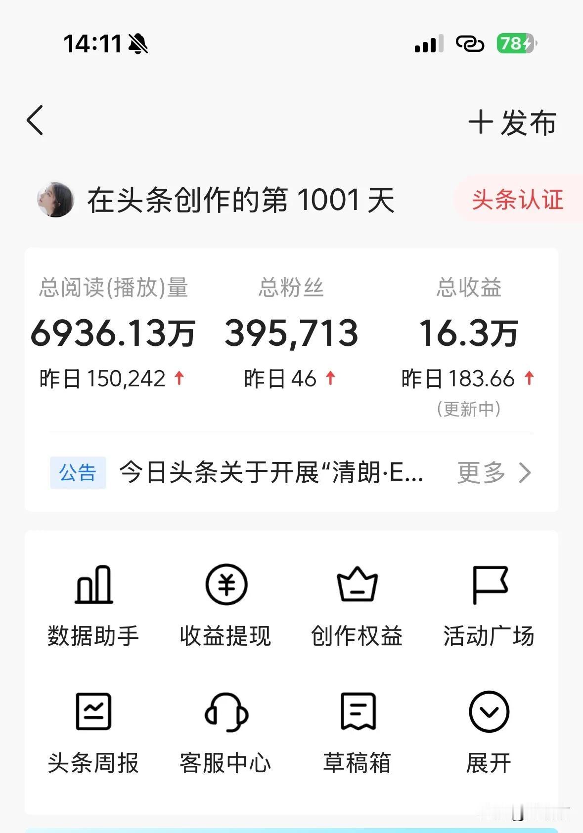 昨天是我来到头条满1000天的日子,收益为16.28万,折算成160块每天。这个数据虽然比不上那些大咖,但总的说来我自己还是很满意的。 毕竟之前每天送完孩子就闲着,想过打零工。 之前试过超市理货,四小时给50,还有做美甲,但嫌受拘束,最后决定写自媒体。超市那活儿钱少,美甲要接触客户,她更爱自由,就算没保障也想试试。 刚开始我连怎么写都不清楚,慢慢看别人文章,学怎么组织语言。千万别照抄,也没必要花钱学班,就靠摸索。写久了才发现,坚持比啥都重要,光有兴趣不够,还得天天更新。 头几个月基本赚不到钱,有段时间一天才几毛,但没放弃。要当长期主义者,反正不用坐班,每天抽空写就行,积少成多总会有时候。 现在每天发两篇,内容都是生活里能想到的东西,自己感兴趣的话题更容易下笔。虽然偶尔也焦虑,但钱比兼职多,还能照顾家里,这点很满意。 后来发现,自由工作最难的是管得住自己。有时想偷懒,但想到之前投入的功夫就坚持下来。平台规则老变,要不停学新技巧,跟得上才能不掉队。 有人问值得吗,我说要是喜欢写,就试试,要是图快钱肯定不行。自媒体涨粉慢,熬过前三个月关键期再说。现在身边姐妹也有几个开始做,但能坚持下来的不多。 最近有公司想找她合作,但她还在考虑,怕影响主业。目前还是自己写舒服,钱够花,也不用看领导脸色。计划继续写下去,说不定哪天真的成副业了。 事情就是这样,想做自媒体得先做好攒人品的准备,钱不会突然掉下来,但至少日子能自由安排,这点对我来说很值。