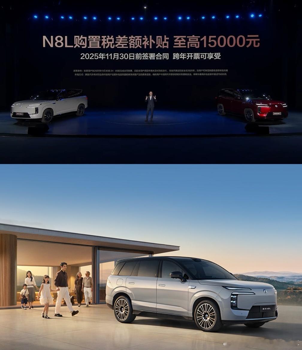 腾势N8L上市价:29.98万元和32.98万元。购置税差额补贴1.5万元。
