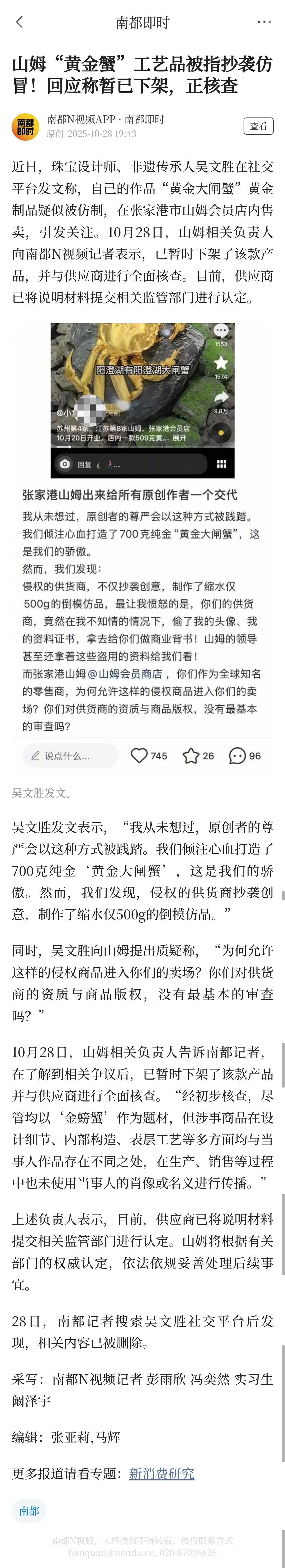 #山姆黄金蟹已下架#【山姆“黄金蟹”工艺品被指抄袭仿冒!回应称暂已下架,正核查】#山姆黄金蟹侵权投诉人已删文#近日,珠宝设计师、非遗传承人吴文胜在社交平台发文称,自己的作品“黄金大闸蟹”黄金制品疑似被仿制,在张家港市山姆会员店内售卖,引发关注。10月28日,山姆相关负责人向南都N视频记者表示,已暂时下架了该款产品,并与供应商进行全面核查。目前,供应商已将说明材料提交相关监管部门进行认定。