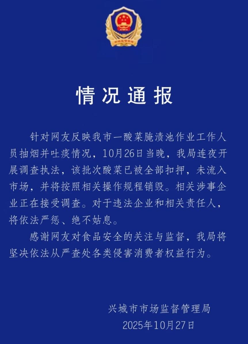 酸菜,到了冬季里是东北人餐桌上的家常菜。酸菜炖粉条,酸菜炖大鹅,是东北具有当地特色的美食。 老坛酸菜泡面,方面里有特殊味道的精品,受到很多食客的喜爰,但是,这个”老吐痰酸菜“别说让你吃一口,就是看一眼,都觉得十分恶心。 近日,辽宁葫芦岛一段酸菜企业生产视频让网友们愤慨,一名工作人员站在酸菜池中,随口乱吐一阵,生产乱象触目惊心! 针对网爆,10月26日晚,当地市场监督局连夜开展调查执法,将该批次酸菜扣压销毁,未流入市场。并对涉事企业当事人接受调查,对违法企业和相关责任人,将以法处理,决不姑息。 这个当事人,觉得自已不吃,就出肮脏操作?你觉得干坏事神不知鬼不觉吗?人在做,天在看。你做了损事不仅毁了企业名誉,自己也难逃法律惩罚!