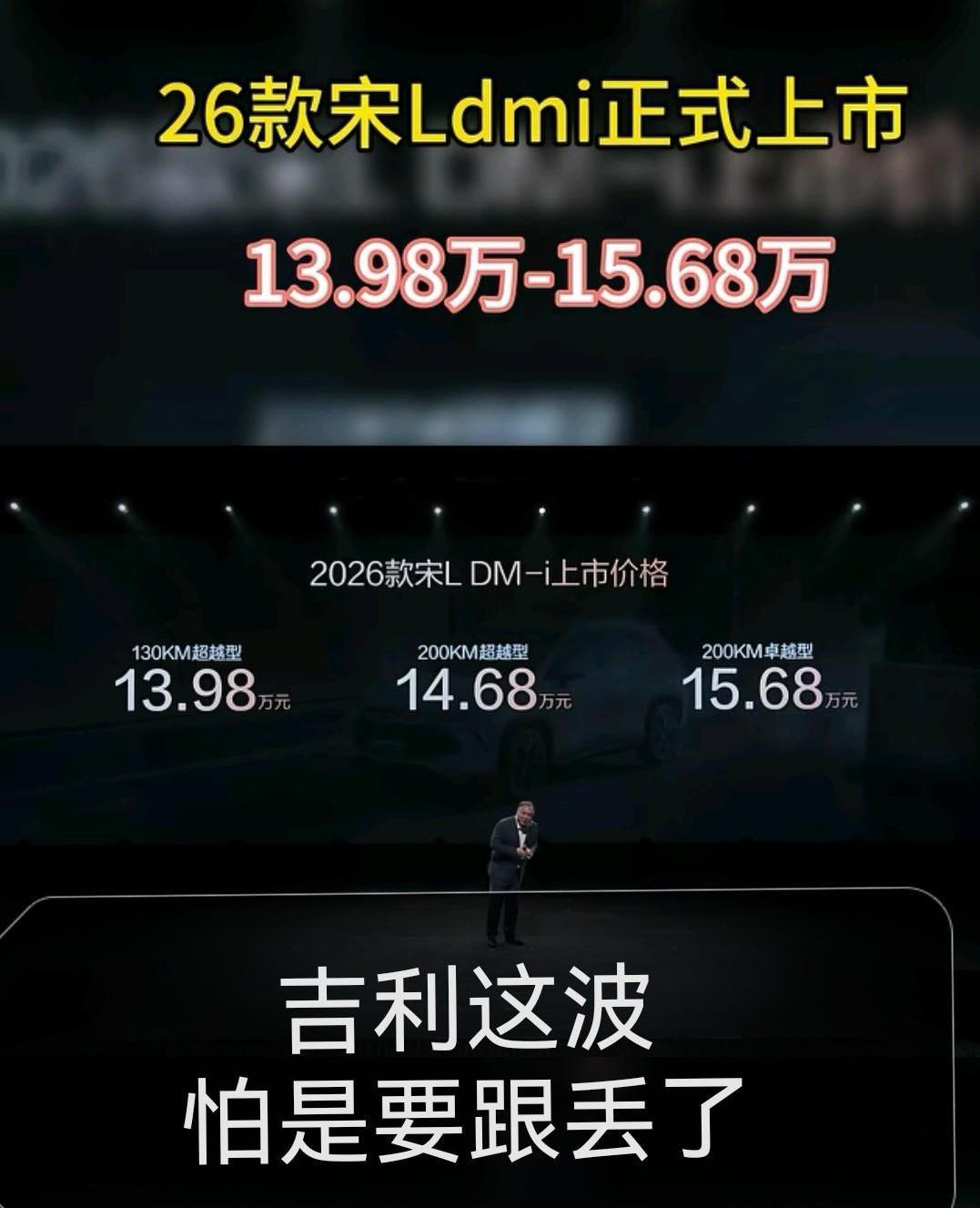 吉利这回估计肠子都悔青了。 辛辛苦苦学了一整年,以为摸透了比亚迪的套路。 结果人家直接把桌子掀了,不带这么玩的。 过去市场的玩法很明确,车企用50到60公里的纯电续航,造一个插电混动车型出来,目的就是把价格打下来,让大家觉得很便宜。吉利银河系列就是这个思路的忠实执行者,L6和L7都是这么干的。 谁能想到,比亚迪自己革自己的命。从汉的加推版开始,再到现在的宋L,直接把入门车型的纯电续航拉到100公里以上,价格却没怎么动。这一下,就把50公里续航的车型衬托得像是上个时代的产物。 这一招实在是太狠了,简直是釜底抽薪。等于直接告诉市场,以后低于100公里续航的插混,就别拿出来卖了。这让刚刚推出一堆新车的吉利银河系列,处境变得非常尴尬,刚一出生就好像落后了。 比亚迪敢这么做,底气就在于它的电池是自己生产的,成本控制在自己手里。它有能力制定新的游戏规则,让所有对手都必须跟进,跟不上的就自动出局。 这下压力全给到吉利了,银河系列刚铺开就面临生死考验。 你觉得吉利还有机会追上来吗