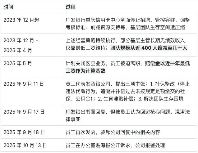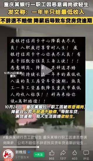 广发银行员工“跳楼事件”,果然还是闹大了。事发广发信用卡重庆分中心,就在10月24日,一名男职工突然跑向窗户,准备从高楼一跃而下轻生,幸而被同事拉住才没酿成惨剧。之所以发生这样的悲剧,不是这一个男员工的事,而是广发重庆信用卡中心的员工,爆料称是集体被广发长期PUA,却又被逼无奈才走上了绝路。 据事后媒体的报道,该男子被逼走极端不是一天两天,而是在长达一年半的时间里,遭遇了“恶意调岗、降薪”,尤其是广发只给当地最低工资,不辞退、不赔偿,摆明了就是逼你自己辞职,这样公司就不用多出一分钱补偿。重庆最低工资标准就2000块,这样的情况下,别说养家糊口了,就是刚毕业的单身青年都难以养活。 丑闻曝出后,外大家才知道原来这事一点都不是偶然,广发重庆信用卡中心员工集体同公司斗了很长时间,广发银行在近两年的时间里,想方设法的让当地员工主动走人,好把运营成本削减到最低。这种做法要说是什么皮包公司或是不入流的外包公司干的很正常,可当这种下三滥的做法同一家全国股份行划等号,着实让人不忍直视。 可若看看广发这几年的经营业绩,多少也能理解广发的不容易了。原本有着天时地利的优势,完全有机会对标招行,再不济也能同浦发、兴业扳手腕的股份行,最后愣是连平安、华夏都干不过,眼看着就要被浙商银行超过,剩下的就同渤海和恒丰银行混吊车尾了。昔日有着“信用卡之王”美誉的大行,居然沦落到靠恶心基层员工压缩成本,除了让人唏嘘,就是一声叹息。