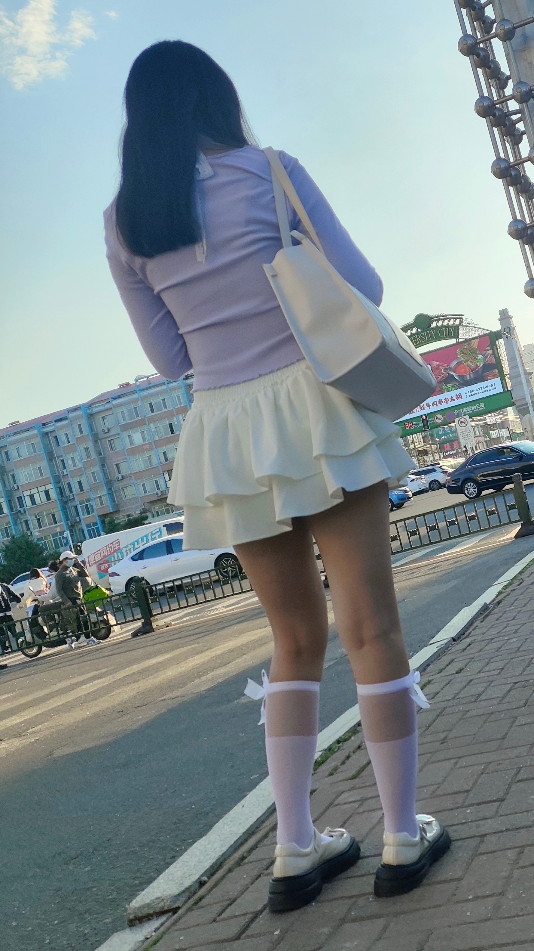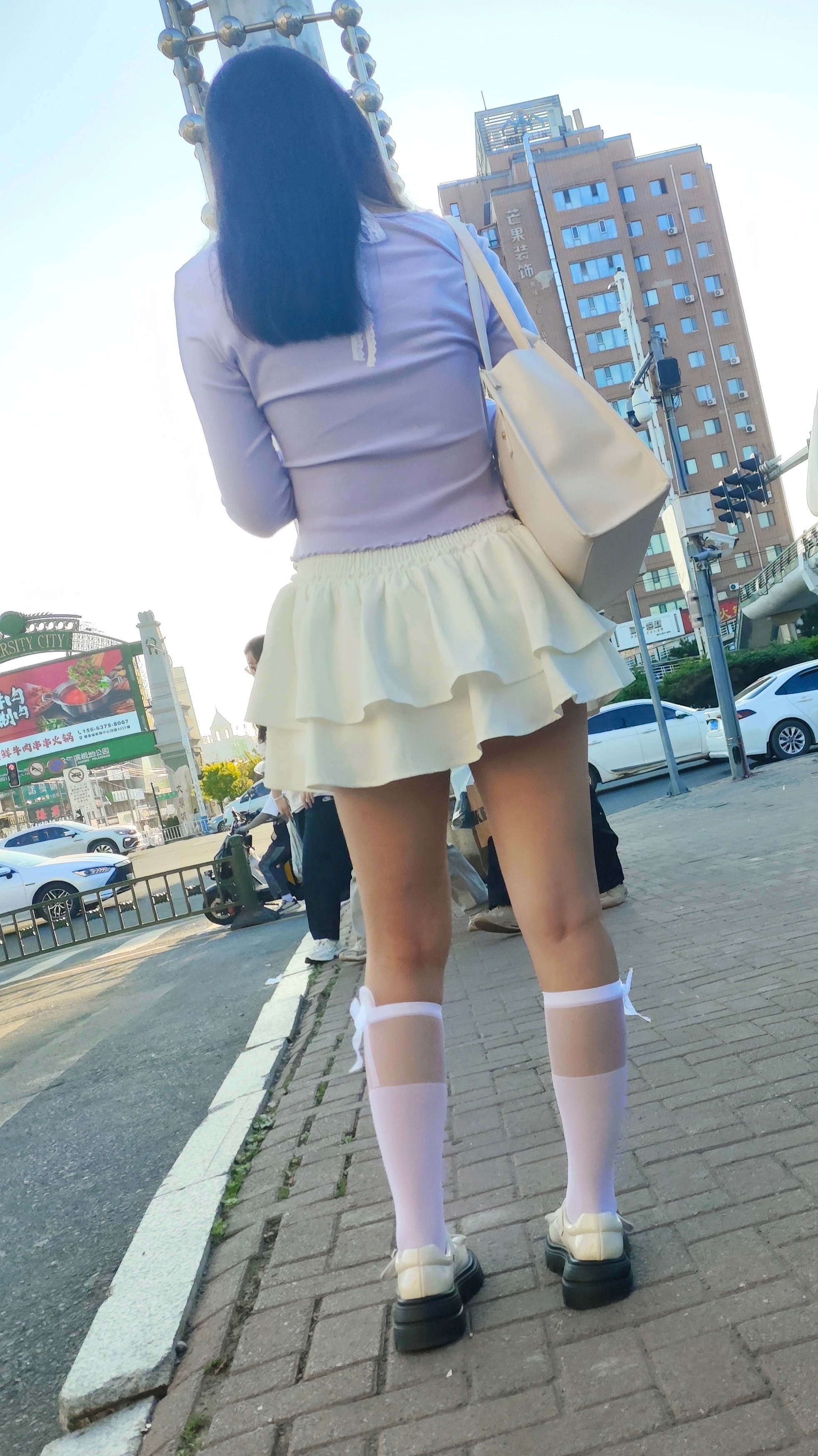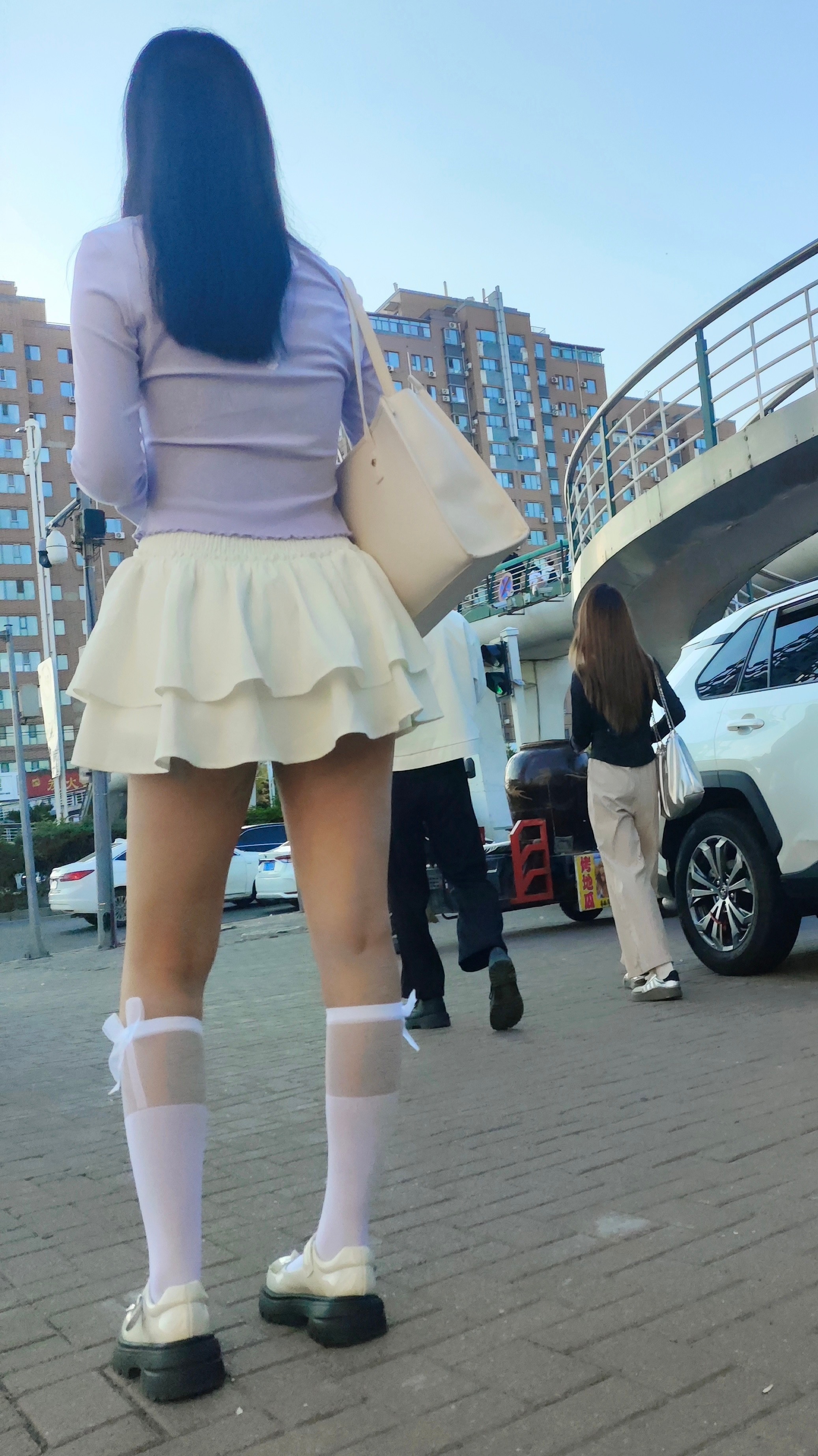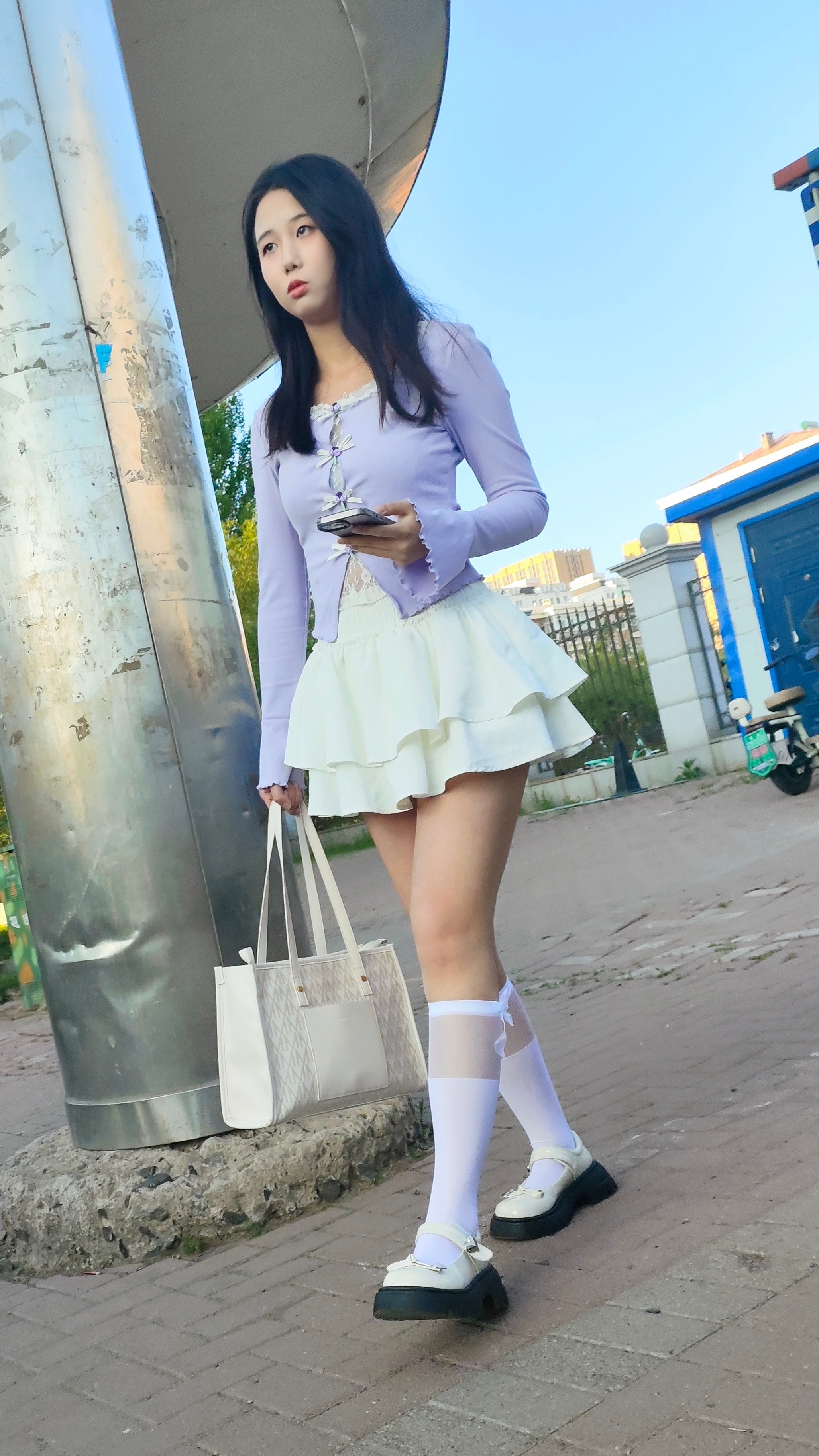 街头偶遇一位穿搭很有气质的女士,浅粉钉珠上衣配浅蓝开叉裙,简约又精致,看着就很有
