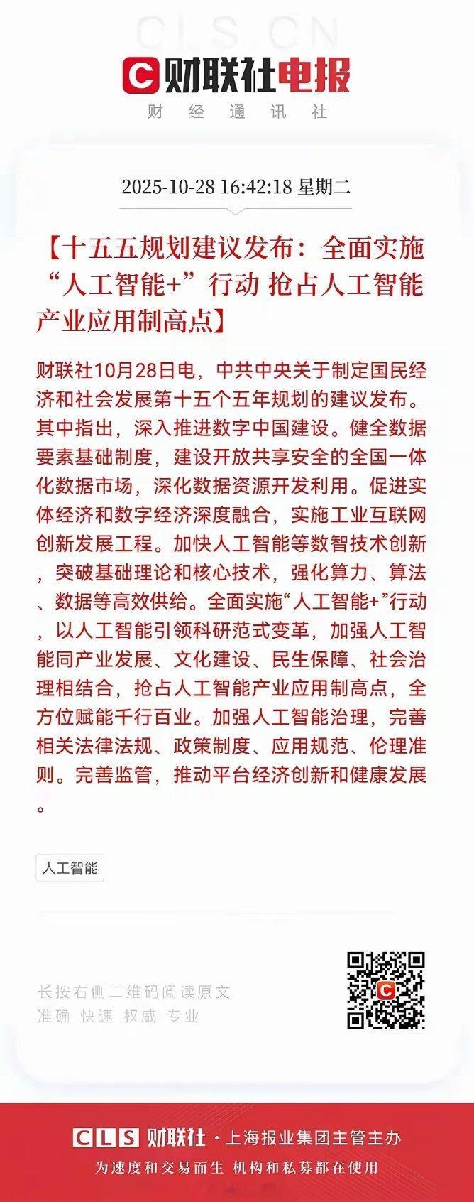 根据十五五的规划,全面实施人工智能抢占人工智能应用制高点,中国在AI人工智能的发展主要还是需要应用场景的落地,因为人工智能的发展没有应用场景,它就是空中阁楼!中国在AI人工智能的相关法律与其安全网络法都在持续跟进!中国在AI人工智能的发展,必然会用到更多的新型技术,也带动了中国芯片企业的创新与发展,同样带动中国的科技发展以及企业转型!