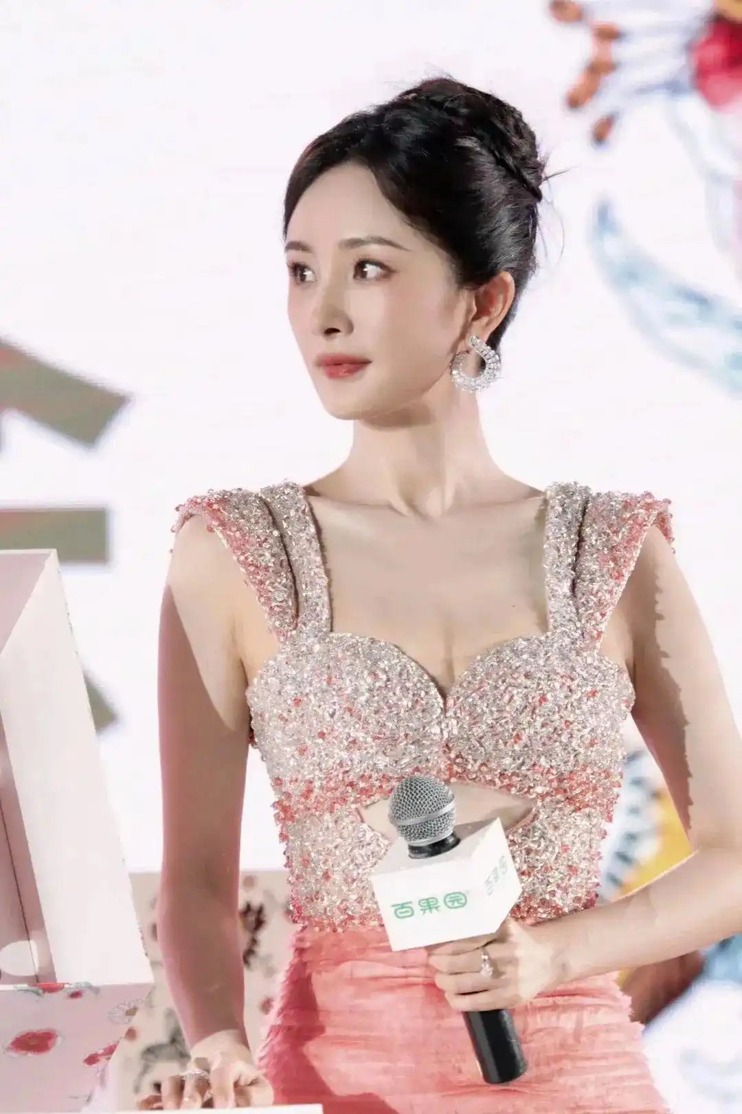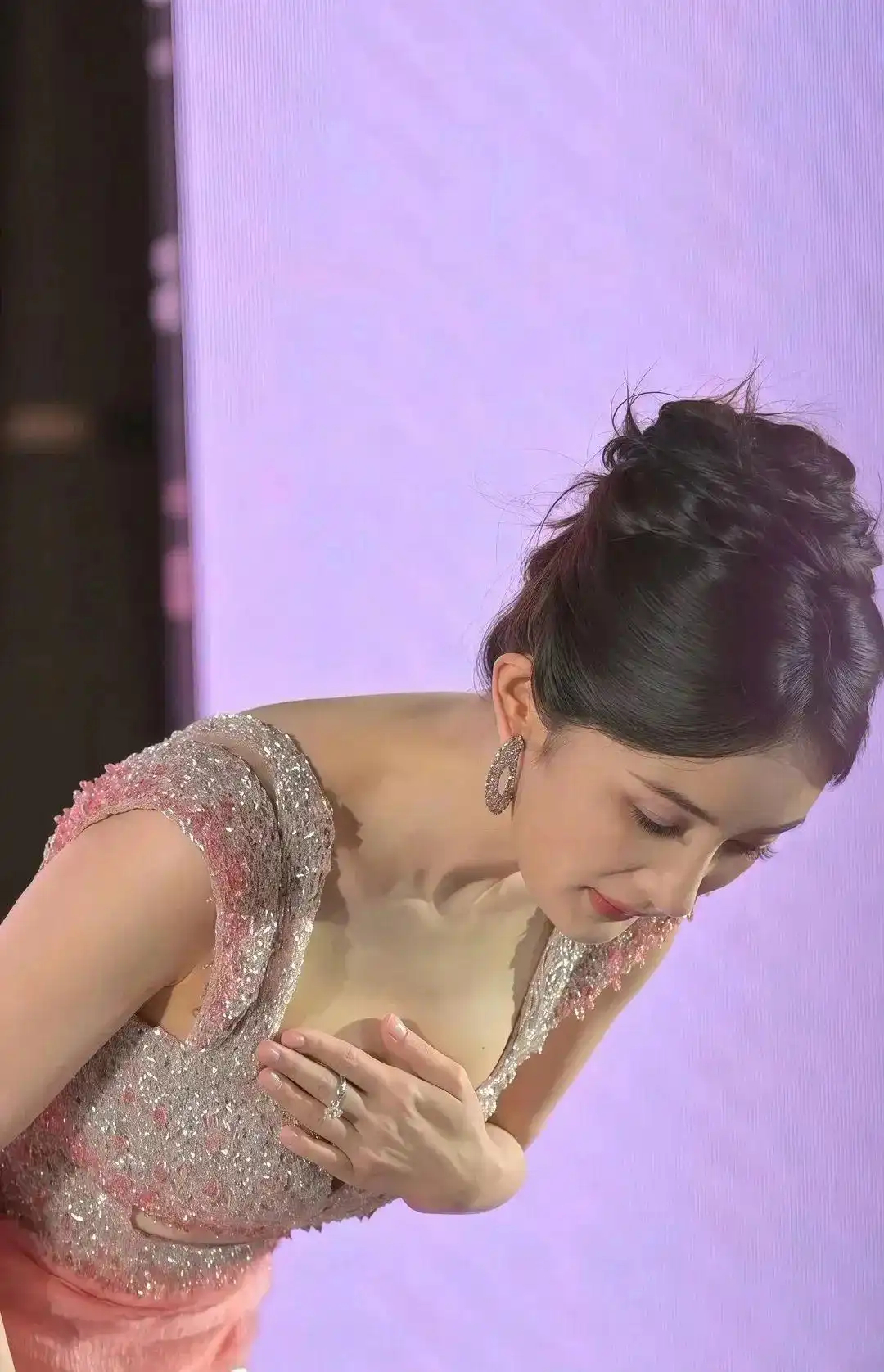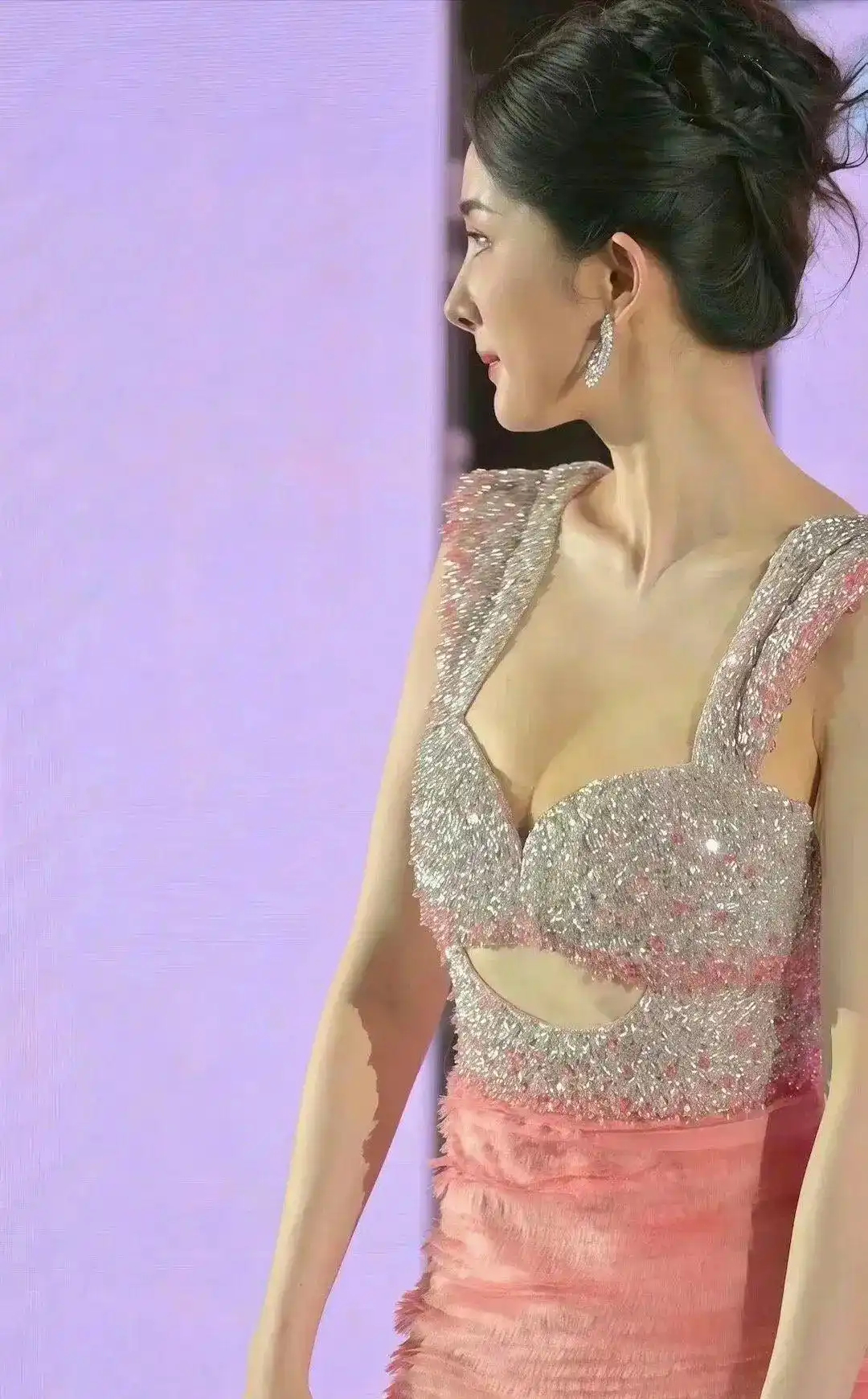 身着粉色礼服,银色亮片在灯光下轻轻闪烁,如同夜空中最亮的星,不仅映衬出她白皙的肌肤,更添了几分高贵与神秘。