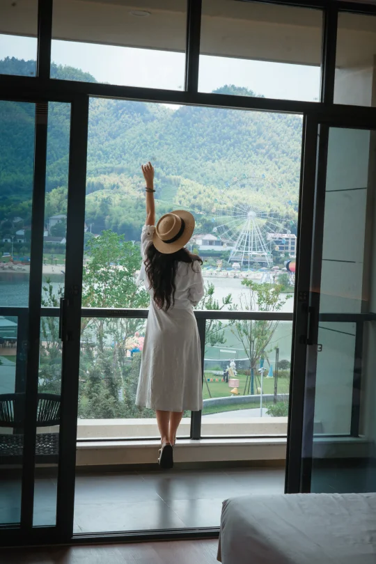 晚上可以住在君澜,背山面水库,落地窗看湖景+摩天轮!亲子房超大,带儿童乐园
