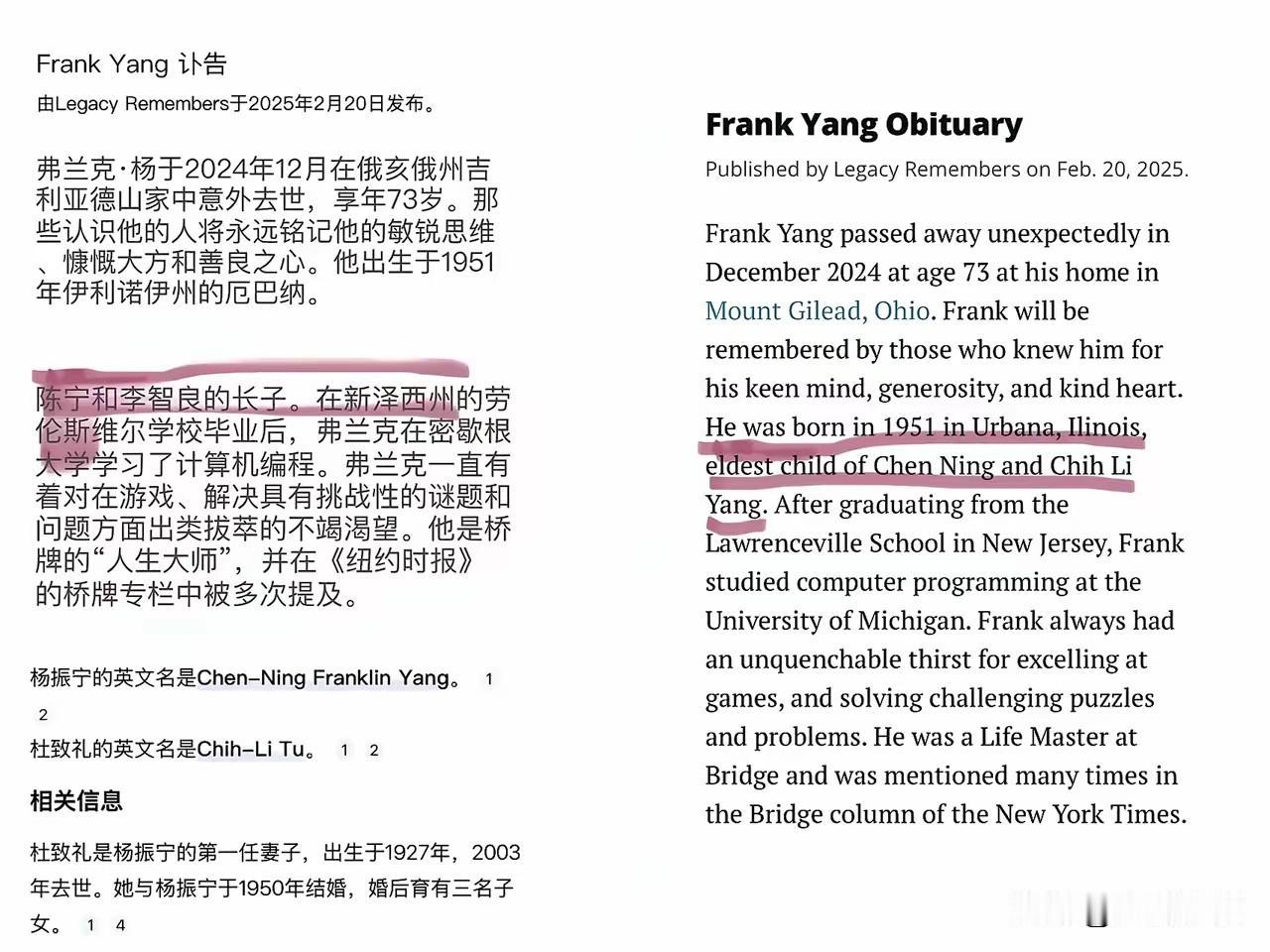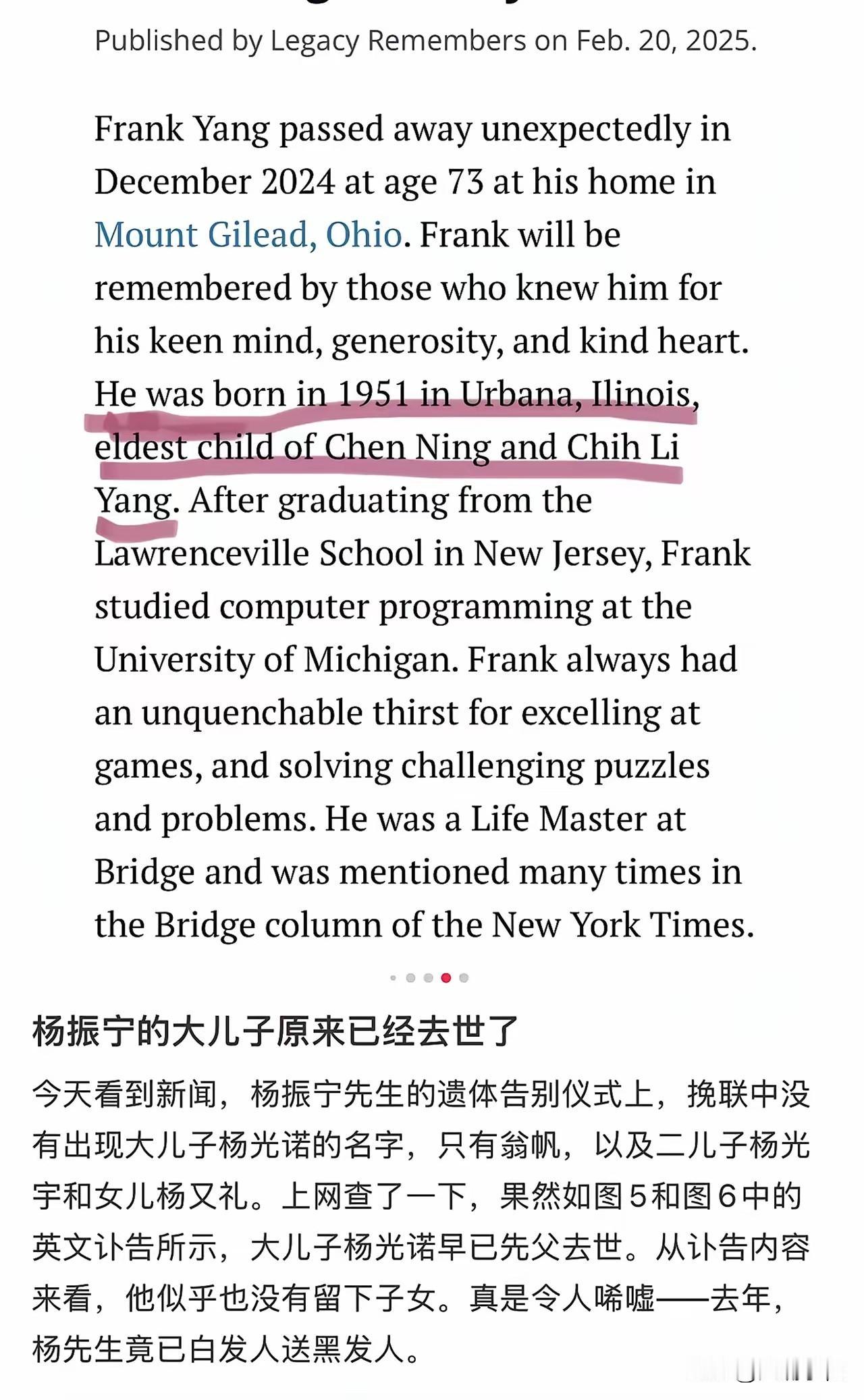 杨振宁葬礼,大儿子没有现身,挽联上也只有二儿子和女儿的名字,没有发现儿子杨光诺的名字,这让很多人觉得奇怪。 按照中国传统,父亲去世,儿子即便不能到场,挽联花圈是少不了的,但杨光诺人没到,花圈也没到。 有国外网友爆料,早在去年12月份,就在网上看到了杨光诺的讣告,父母的名字也和杨振宁杜致礼对得上,根据讣告内容,他疑似没有子女。 因为杨振宁年事已高,大儿子去世的消息,并没有告诉杨振宁,只对他说身体不太好,所以杨振宁直到去世,都不知道大儿子已经不在了。 这不禁令人唏嘘,原以为杨光诺缺席葬礼,抱遗像的应该是长子长孙,原来不是。