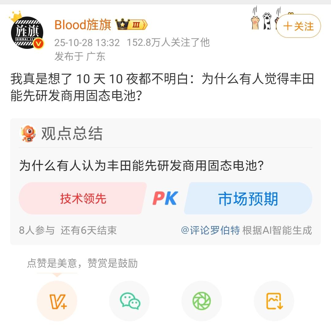 艹老师:我真是想了 10 天 10 夜都不明白:为什么有人觉得丰田能先研发商用固态电池? 这是因为前几天的一篇报道说丰田准备和某家公司合作进行固态电池研发,然后就引申出来了丰田先研发商用固态电池。 固态电池的突破在哪一家车企上都有可能,因为这种突破可能需要发散性思维,突然跳出原有的框架。