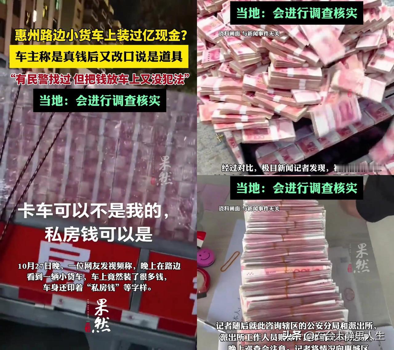 惠州路边这货车,胆子比运钞车还大! 10月27号晚,有人拍到视频:小货车停在麦兴路路口,后厢裹着塑料膜,里面全是疑似百元大钞,车身还印私房钱。车主一开始说“是真钱,一个亿,不怕偷”,记者亮身份立刻改口“是道具”。 有人说肯定是真钱,车主怕查才圆谎;也有人说就是炒作,道具博流量;还有人说就算假的,这么搞也太招摇。 我觉得不管真假都离谱,真钱的话,过亿现金怎么来的?银行能取这么多?就敢扔路边?假的话,博眼球也不挑合理的,当大家傻啊? 大家觉得这钱是真的还是道具?