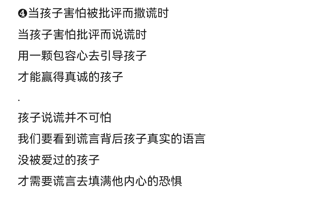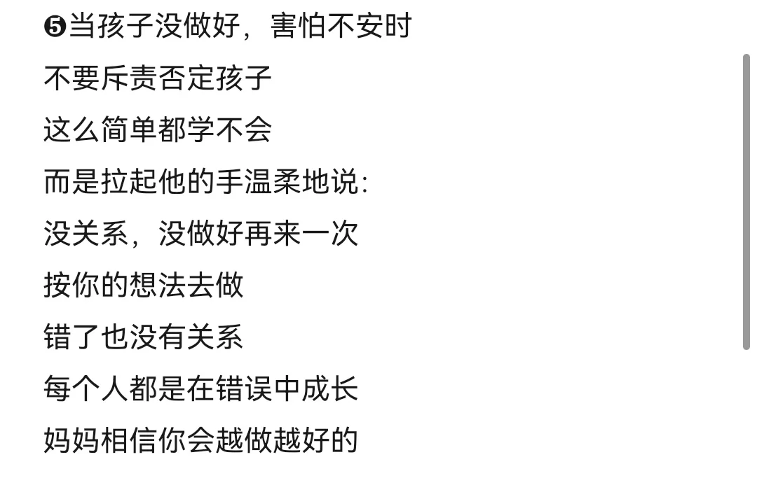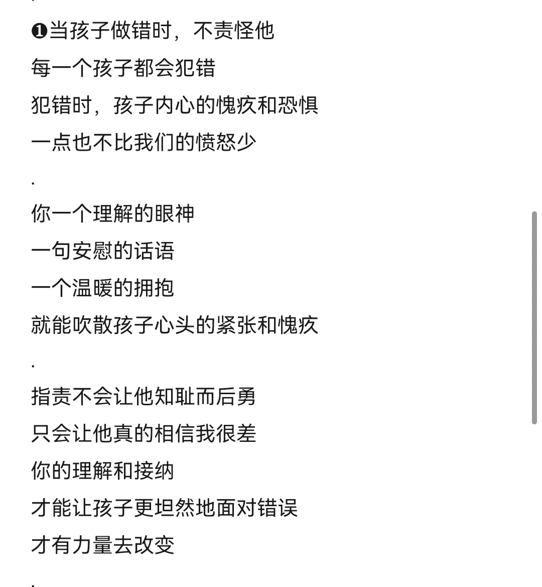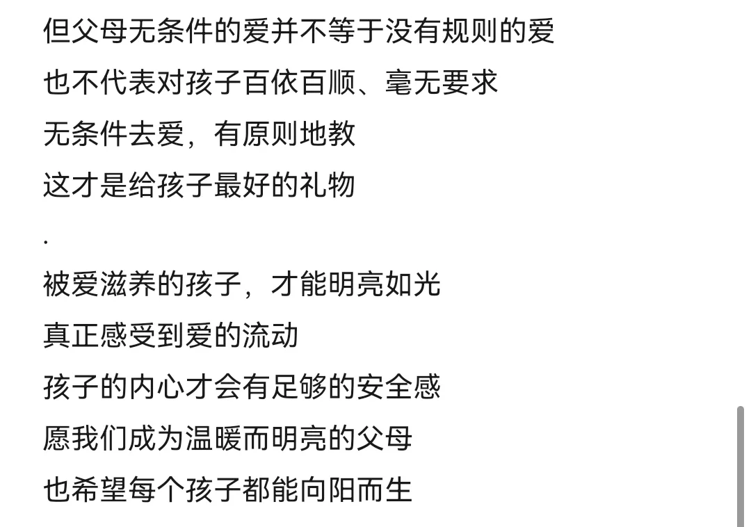 知乎高赞的一句话,无论父母在物质上怎么让孩子富有 都不如养出一个精神富足的孩子 说出了父母的心声 因为内心富足的孩子,自信开朗有主见 有足够的心理能量和底气面对生活的风风雨雨 . 什么样的家长,就赋予孩子什么样的心理能量 想养出一个内心富足的孩子 父母首先要把爱和阳光种进孩子心里 . 很多父母把爱理解为让孩子快乐 其实,真正的爱远比这些深刻 . 真正的爱是孩子远远不如你期待时 你没有失望气馁,没有暴跳如雷,没有疾风骤雨 而是理解和接纳孩子 不指责,不放弃 陪伴孩子一起走过那些蕞难熬的日子 . 真正的爱是接纳孩子的每一个存在的片刻 正如爱的繁体字,"愛",拆开是受和心 也就是用心全然接受 尤其这些时刻,请成为孩子蕞坚强的后盾 . ❶当孩子做错时,不责怪他 每一个孩子都会犯错 犯错时,孩子内心的愧疚和恐惧 一点也不比我们的愤怒少 . 你一个理解的眼神 一句安慰的话语 一个温暖的拥抱 就能吹散孩子心头的紧张和愧疚 . 指责不会让他知耻而后勇 只会让他真的相信我很差 你的理解和接纳 才能让孩子更坦然地面对错误 才有力量去改变 . ❷当孩子遇到困难,想要退缩放弃时 不要打压孩子: 胆小鬼,这点困难算什么 而是耐心地鼓励他: 妈妈知道这个确实不那么好做 但是你已经开始了就很勇敢 任何事开始都比较难 只要我们多试几次就会越做越好 . ❸当孩子无理取闹,情绪失控时 不要发火,呵斥孩子:别闹了,烦死了 而是温柔地告诉他: 宝贝,我知道你现在很生气 我们都有自己的情绪,妈妈理解你 你可以试试把生气画出来或我们跳一跳 等你好了,我们一起找解决办法 . ❹当孩子害怕被批评而撒谎时 当孩子害怕批评而说谎时 用一颗包容心去引导孩子 才能赢得真诚的孩子 . 孩子说谎并不可怕 我们要看到谎言背后孩子真实的语言 没被爱过的孩子 才需要谎言去填满他内心的恐惧 . ❺当孩子没做好,害怕不安时 不要斥责否定孩子 这么简单都学不会 而是拉起他的手温柔地说: 没关系,没做好再来一次 按你的想法去做 错了也没有关系 每个人都是在错误中成长 妈妈相信你会越做越好的 . ❻孩子胆小时,不责怪他懦弱 ➐孩子当众出丑时,维护孩子的自尊 详细查看图片 . 父母无条件的爱并不等于没有规则的爱 也不代表对孩子百依百顺、毫无要求 无条件去爱,有原则地教 这才是给孩子蕞好的礼物 . 被爱滋养的孩子,才能明亮如光 真正感受到爱的流动 孩子的内心才会有足够的安全感 愿我们成为温暖而明亮的父母 也希望每个孩子都能向阳而生父母与孩子