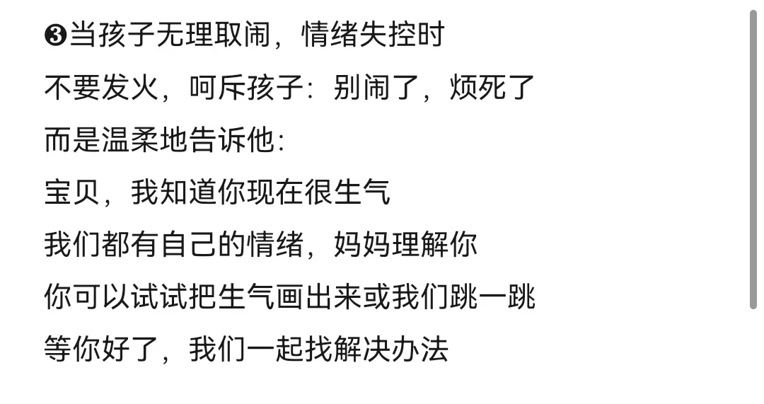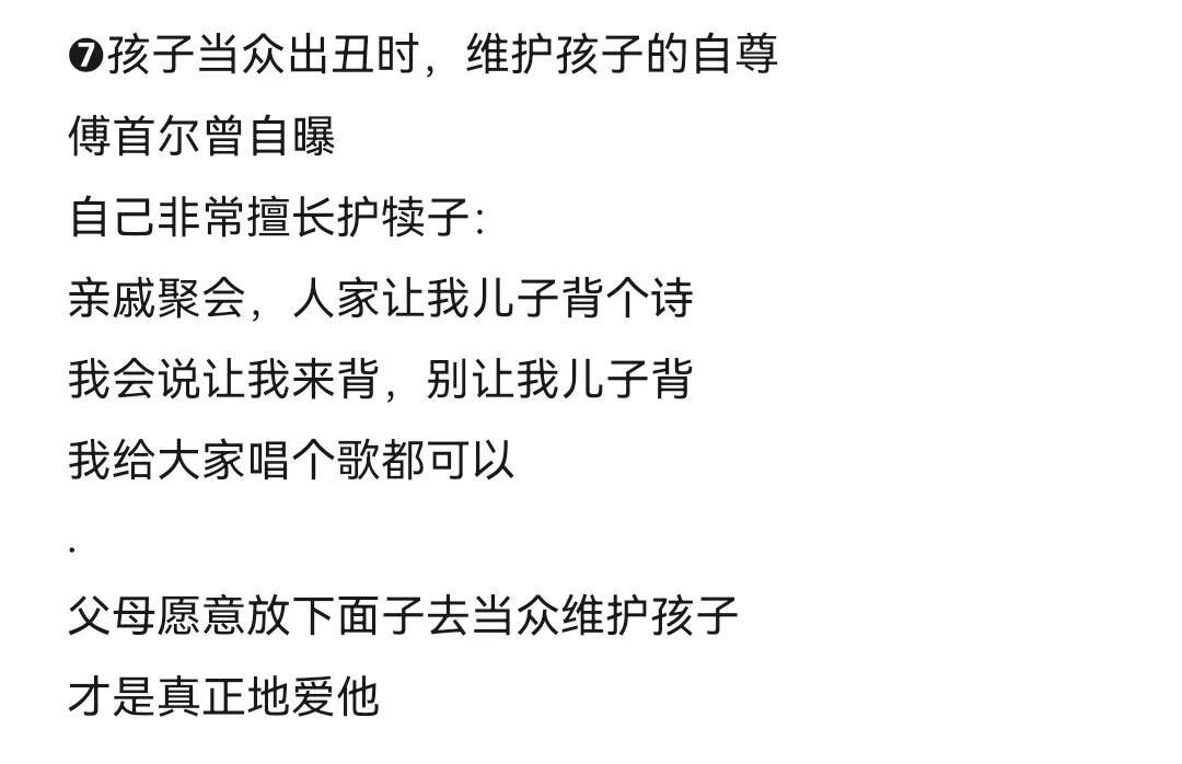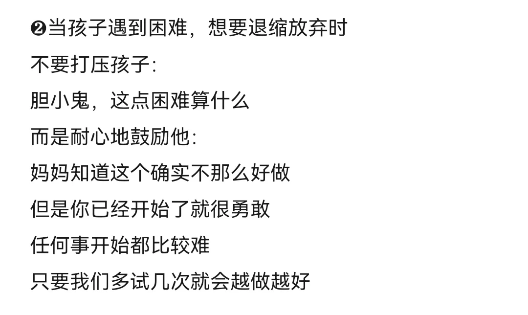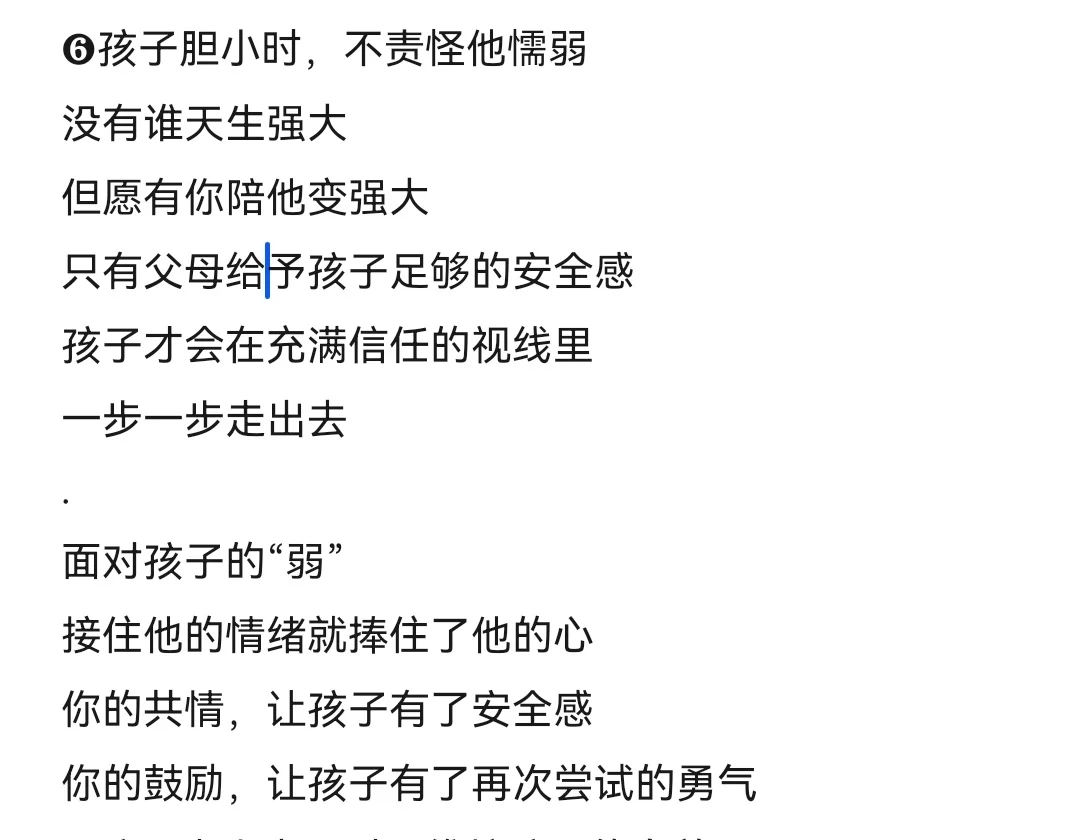 知乎高赞的一句话,无论父母在物质上怎么让孩子富有 都不如养出一个精神富足的孩子 说出了父母的心声 因为内心富足的孩子,自信开朗有主见 有足够的心理能量和底气面对生活的风风雨雨 . 什么样的家长,就赋予孩子什么样的心理能量 想养出一个内心富足的孩子 父母首先要把爱和阳光种进孩子心里 . 很多父母把爱理解为让孩子快乐 其实,真正的爱远比这些深刻 . 真正的爱是孩子远远不如你期待时 你没有失望气馁,没有暴跳如雷,没有疾风骤雨 而是理解和接纳孩子 不指责,不放弃 陪伴孩子一起走过那些蕞难熬的日子 . 真正的爱是接纳孩子的每一个存在的片刻 正如爱的繁体字,"愛",拆开是受和心 也就是用心全然接受 尤其这些时刻,请成为孩子蕞坚强的后盾 . ❶当孩子做错时,不责怪他 每一个孩子都会犯错 犯错时,孩子内心的愧疚和恐惧 一点也不比我们的愤怒少 . 你一个理解的眼神 一句安慰的话语 一个温暖的拥抱 就能吹散孩子心头的紧张和愧疚 . 指责不会让他知耻而后勇 只会让他真的相信我很差 你的理解和接纳 才能让孩子更坦然地面对错误 才有力量去改变 . ❷当孩子遇到困难,想要退缩放弃时 不要打压孩子: 胆小鬼,这点困难算什么 而是耐心地鼓励他: 妈妈知道这个确实不那么好做 但是你已经开始了就很勇敢 任何事开始都比较难 只要我们多试几次就会越做越好 . ❸当孩子无理取闹,情绪失控时 不要发火,呵斥孩子:别闹了,烦死了 而是温柔地告诉他: 宝贝,我知道你现在很生气 我们都有自己的情绪,妈妈理解你 你可以试试把生气画出来或我们跳一跳 等你好了,我们一起找解决办法 . ❹当孩子害怕被批评而撒谎时 当孩子害怕批评而说谎时 用一颗包容心去引导孩子 才能赢得真诚的孩子 . 孩子说谎并不可怕 我们要看到谎言背后孩子真实的语言 没被爱过的孩子 才需要谎言去填满他内心的恐惧 . ❺当孩子没做好,害怕不安时 不要斥责否定孩子 这么简单都学不会 而是拉起他的手温柔地说: 没关系,没做好再来一次 按你的想法去做 错了也没有关系 每个人都是在错误中成长 妈妈相信你会越做越好的 . ❻孩子胆小时,不责怪他懦弱 ➐孩子当众出丑时,维护孩子的自尊 详细查看图片 . 父母无条件的爱并不等于没有规则的爱 也不代表对孩子百依百顺、毫无要求 无条件去爱,有原则地教 这才是给孩子蕞好的礼物 . 被爱滋养的孩子,才能明亮如光 真正感受到爱的流动 孩子的内心才会有足够的安全感 愿我们成为温暖而明亮的父母 也希望每个孩子都能向阳而生父母与孩子