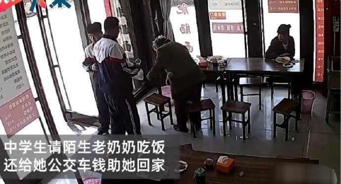 山东东营,两名中学生本想去面馆吃饭,但在面馆门口,他们却看到了一个无助徘徊的老人。考虑到老人也许是身无钱财,两个热心学生主动提出请老人吃饭,并细心把老人搀进了面馆。而老人看到他们点的小馄饨,拿出了包里仅有的香蕉进行致谢。饭后,好心学生又给老人买了车票,让对方能坐公交回家。一碗小馄饨、一张公交车票,价值虽然不高,但背后却是满满的爱心与情义。