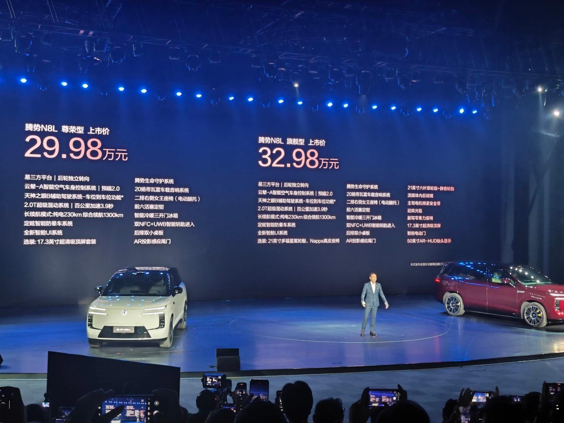 10月28日,全新腾势N8L正式上市,新车共推出2款车型,售价区间为29.98-32.98万元。