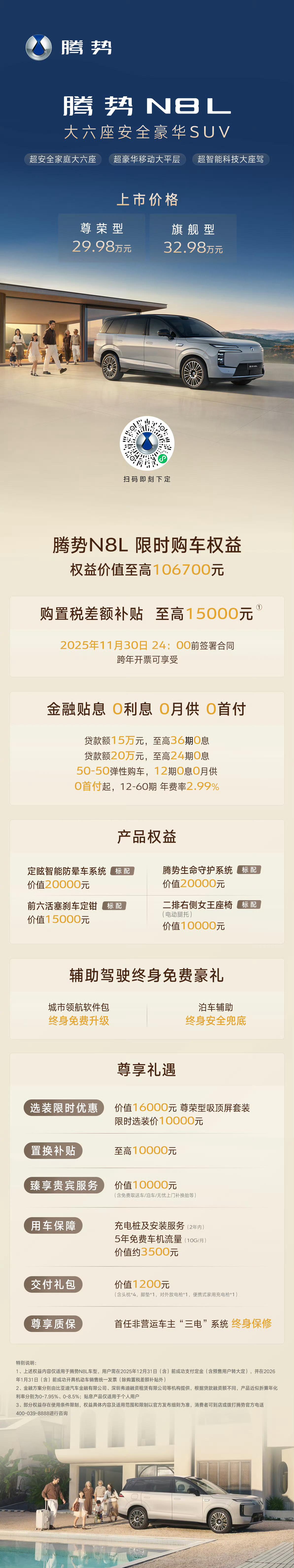 大六座SUV首选腾势N8L29.98万起我之前就说腾势N8肯定大降价,果然降到30以内了…