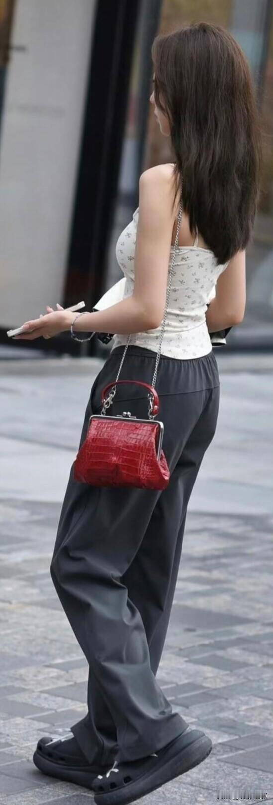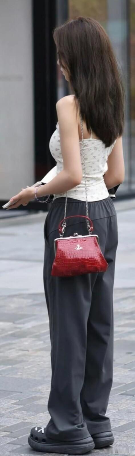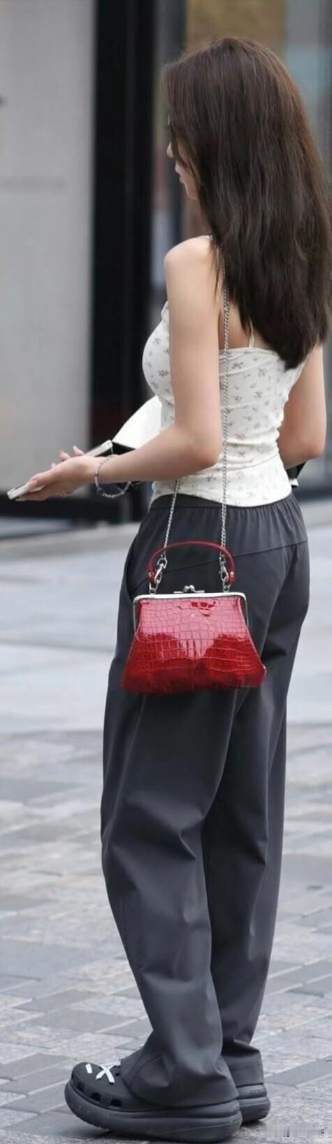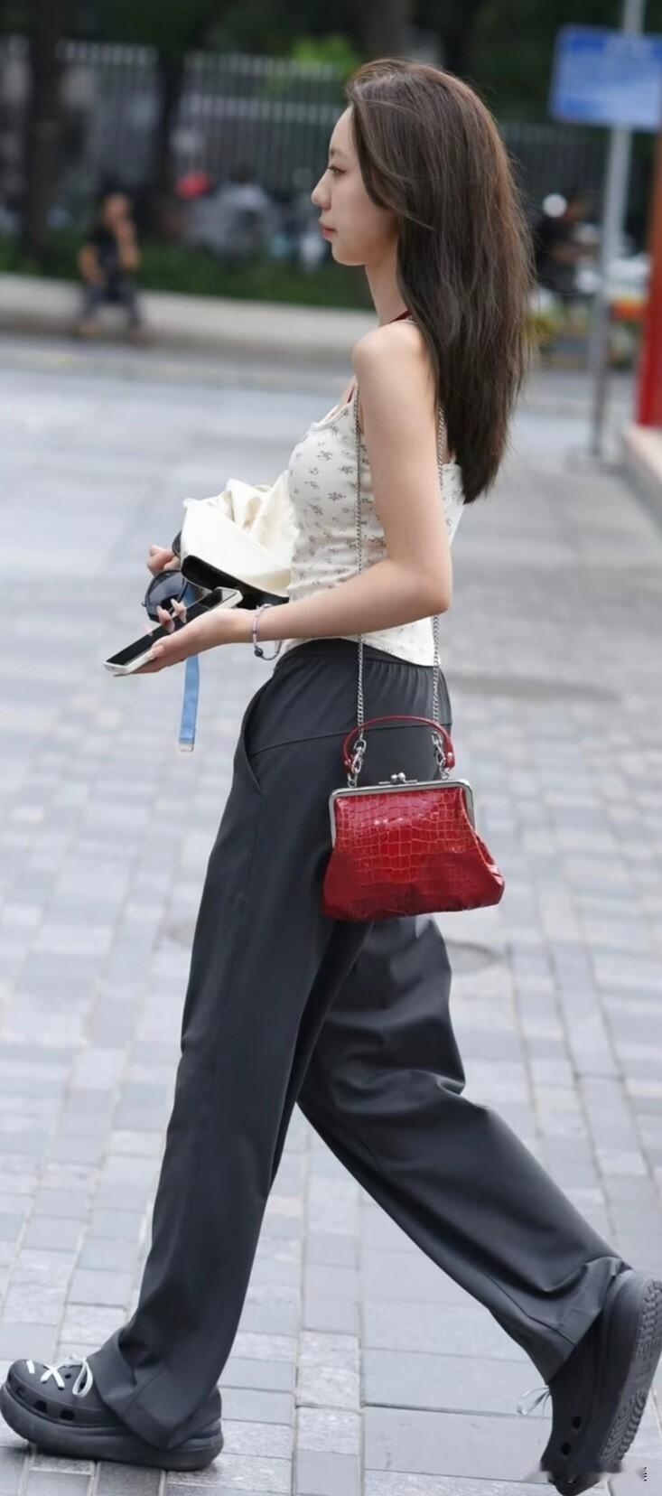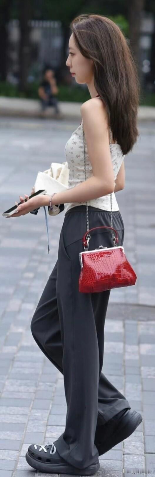 街头这位女生穿搭很有巧思,碎花吊带配灰色阔腿裤,红色小包点睛,再搭双厚底鞋,休闲又带点个性,还挺时髦的。