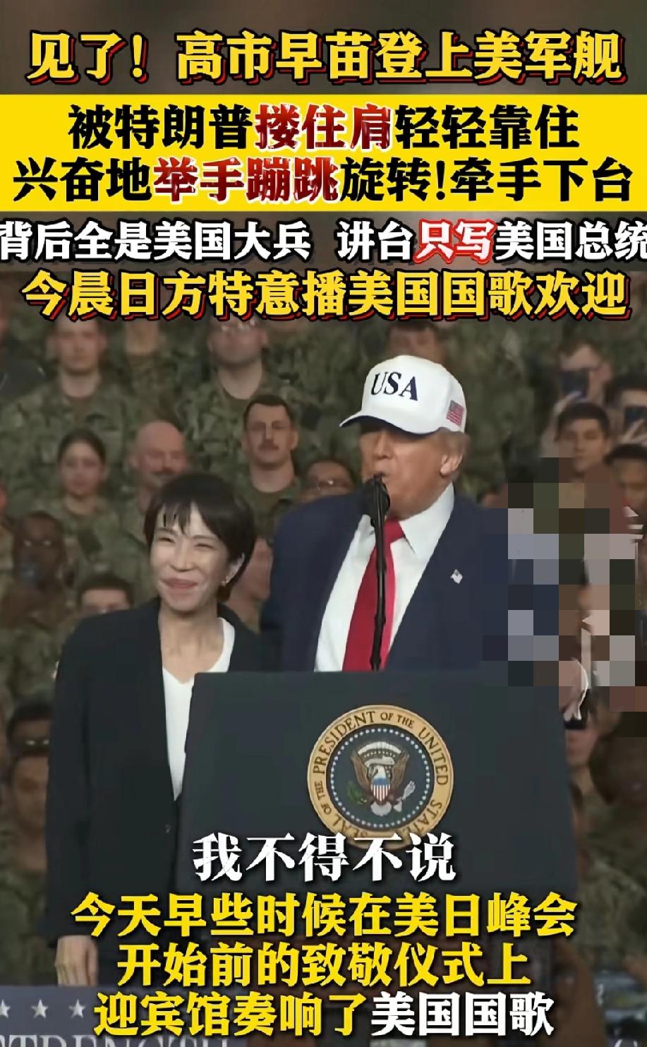 没救了! 这是美国在日本的横须贺港的军事基地,在美军的航母上,那就是美国的领土,高氏杂苗还欢呼雀跃的崩跳了一圈,轻搂了一下,双双牵手才离开! 是个正常人都不会去参加这样的活动,但是他参加了,还很高兴,畏威的性格展现的淋漓尽致,但同时又凌弱。 种种行为让人实在不忍直视! 日本一直抱怨说他们不是一个正常国家,我现在觉得,他们真的不正常,一点都不正常,也没想着让自己正常。 特朗普在演讲中说,80年来,从敌人变朋友,不打不相识,如今的友谊牢不可破,最亲密的盟友。我想问问日本人,你们真的开心?