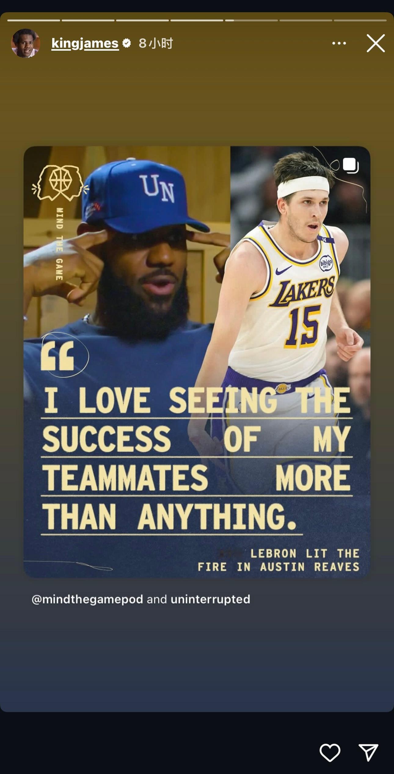 詹姆斯更新动态:“比起任何事,我更喜欢看到队友取得成功。”​​​