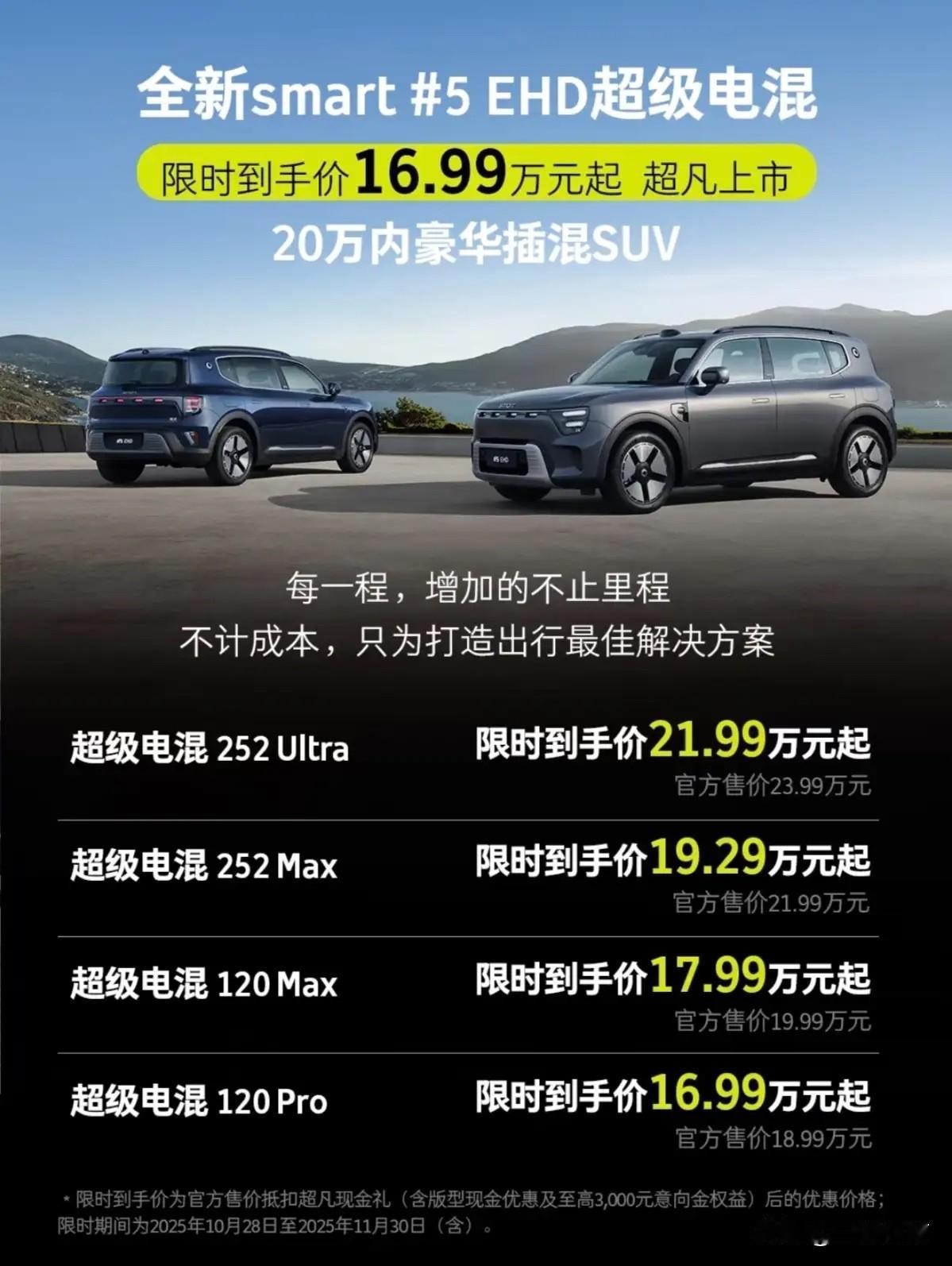 16.99万起,又是走迪子的路让迪子无路可走 吉利和奔驰联手打造的全新smart精灵5号一上市,限时16.99万起,比老款纯电版整整便宜7万,这哪是定价,分明是往混动市场扔了颗炸雷! 之前谁能想到,挂着奔驰设计标的高端车能卖得这么“亲民”?老款smart精灵5号纯电版起步就要23.99万,就算打折也得20万往上。现在新款不仅没减配,反而加了一堆硬核配置,这波“降价增配”简直是照着迪子的拿手好戏抄作业,还抄得更狠。 先看这让对手睡不着的核心实力。新款首次用上1.5T插混系统,纯电续航直接干到252km,日常通勤一周充一次电都够了;满油满电综合续航更是飙到1615km,周末全家自驾去周边城市,来回一千公里都不用找加油站,彻底治好了“续航焦虑”。要知道同价位的混动SUV,纯电续航大多卡在150km左右,综合续航也难破1300km,这差距一目了然。 配置更是往“越级”上堆。奔驰全球设计团队操刀的内饰,三联屏连在一起科技感拉满,还标配了森海塞尔音响,音质比不少二十多万的车都能打。前排的零重力座椅能直接放平,跑长途累了躺一会儿太舒服,甚至还有奔驰C级同款的侧方座椅调节按键,细节里全是豪华感。最狠的是智能驾驶,smart Pilot Assist 3.0系统加持,高配版还直接装了激光雷达,高速跟车、自动泊车全不在话下,这配置放在以前得奔30万去。 更绝的是它的“双重靠山”。底盘和三电来自吉利的浩瀚架构,这可是和极氪7X同平台的技术,八百伏快充、高效电机这些硬核配置全继承了;设计和品控又有奔驰把关,方盒子造型辨识度拉满,比同价位的家用SUV颜值高了不止一个档次。等于花16万多,买了“吉利的技术+奔驰的设计”,这性价比谁顶得住? 这波定价直接把竞品逼到了墙角。要知道迪子同级别混动SUV起步价也得17万多,纯电续航才110km,配置更是差着截,没有激光雷达,音响是普通品牌,续航也短了一大截。smart这操作分明是“走迪子的路,让迪子无路可走”,难怪预售72小时就锁单5000台,连高配版都占了六成订单。 其实smart这步棋也是背水一战。去年品牌销量下滑近20%,没完成5万辆目标,急需一款爆款翻身。现在靠插混车型下沉市场,精准戳中了家庭用户“市区用电省钱、长途烧油不慌”的需求,35%的订车用户都是增购的家庭群体,显然找对了方向。
