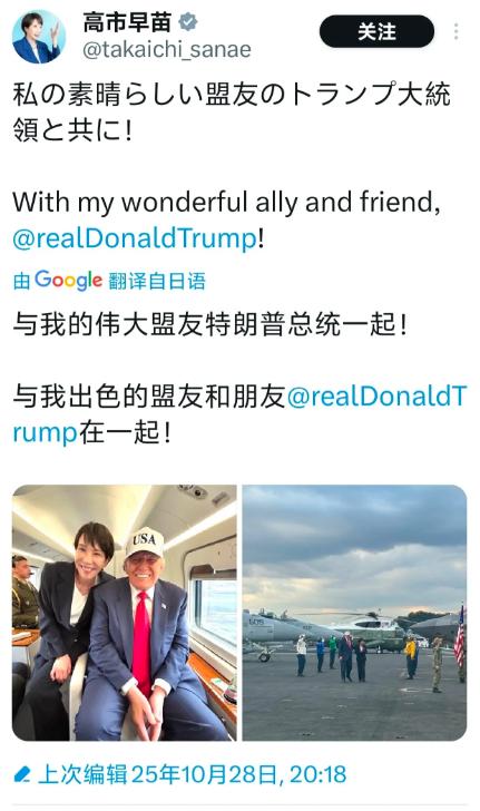 俗话说:男女有别!高市早苗难道不怕梅拉尼娅夫人吃醋吗?10月28日晚,日本首位女首相为了彰显与美总统的关系好,晒出两张合照,一张是在机场一张是在机舱,让人看着他们确实很“亲近”。 从晒出的照来看,高市早苗穿着一身深色职业装,然而美总统的手放在她后背上,这个动作让人看起来两人关系不简单,何况梅拉尼娅夫人并不在场。 还有他们在飞机上拍合影,高市早苗坐在美总统后面,两人贴在一起笑容灿烂,不知道的还以为是一家人,殊不知他们不是父女不是祖孙,也不是夫妻。