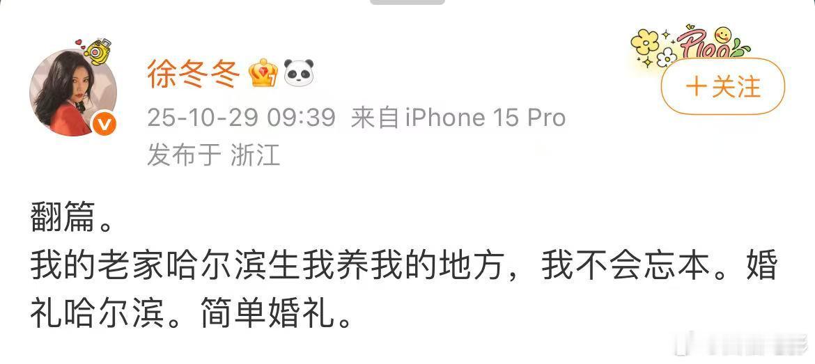 随后,徐冬冬又在评论区留言:“杭州有一场简单请朋友婚礼。哈尔滨是家人家乡人。[心]感恩心[心]”