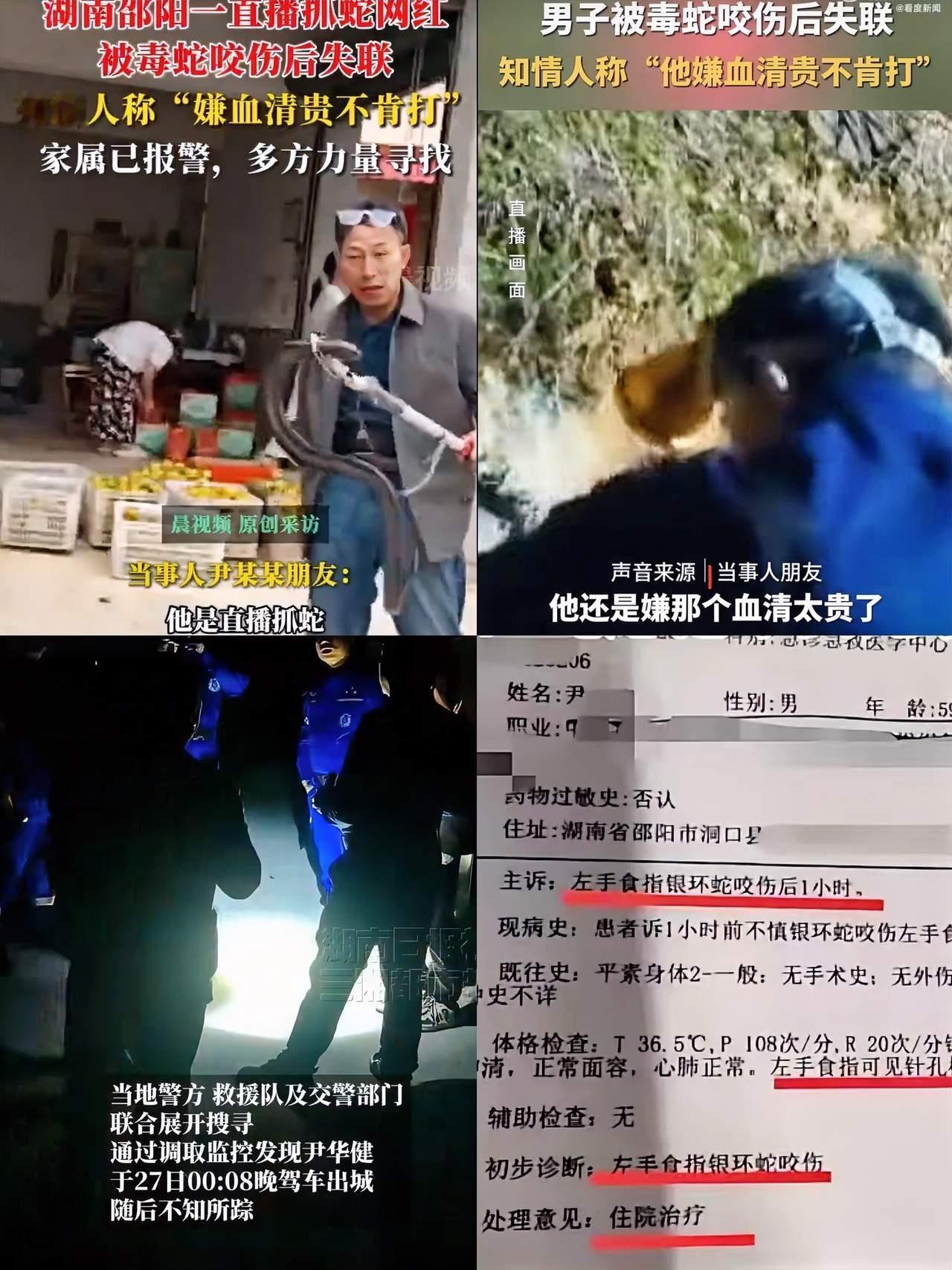 湖南邵阳,被蛇咬伤失联的老尹,刚刚找到了,但又出幺蛾子!59岁的老尹,一见到救援人员,竟然弃车躲开了,到现在人还没下落。有人猜测,老尹是怕被抓去打血清,血清昂贵,自己付不起,所以跑了。 这起看似普通的蛇咬伤事件,却在网络上引发了轩然大波。有人为老尹的遭遇感到心疼,觉得他可能是生活的压力太大,才会在危难时刻选择逃避;也有人猜测,他或许担心被强制打血清,怕承担不起高昂的医疗费用。这个事件,折射出的是我们社会中许多普通人的无奈与挣扎。 老尹,一个59岁的普通农民,或许一辈子都在为家庭操劳,日复一日的辛苦让他早已习惯了低调与忍让。当生命受到威胁时,他的第一反应竟然是躲避。这种反应,或许让人觉得不可思议,但细细想来,却透露出深层的人性真实:在这个充满压力和不确定的社会里,许多像老尹一样的人,面对突如其来的困难时,第一反应并不是勇敢面对,而是选择逃避。 为什么会这样?我们不妨从他的一举一动中,看出一个社会的缩影。血清昂贵,医疗资源不平衡,许多普通人面对突发的医疗费用,心中都难免会有恐惧和担忧。或许,老尹的躲避,不仅仅是怕花钱,更是对未来的无助感的体现——在这个社会,低收入家庭的生活压力,已经成为一种沉重的枷锁。 然而,事情的真相远比表面复杂。有人说,老尹可能是怕被“打血清”,怕自己付不起,选择逃跑。也有人猜测,他是在担心被“抓去打疫苗”或“打药”的强制措施。这些猜测,都折射出一个令人担忧的事实:在某些地方,普通人的生命安全和基本权益,似乎还没有得到充分的保障。我们在关注这个事件的同时,也不得不反思:我们这个社会,是否真正关心每一个普通人的生命与尊严? 这起事件,让我不禁想起我们身边的无数“老尹”。他们或许没有光鲜的外表,没有耀眼的光环,但他们用自己的方式,坚韧不拔地生活着。我们是否也应该用更多的理解和关爱,去看待这些默默无闻的生命?社会的温度,是否也能像那一场救援一样,传递出更多的温暖与希望? 或许,下一次遇到类似的事情,我们可以多一些耐心,多一些理解。毕竟,每个人都在用自己的方式,拼搏着、挣扎着,等待着那个属于自己的光明时刻。让我们从老尹的故事中汲取力量,用善意和行动,为这个社会带来更多温暖。因为,只有当我们真正关心每一个“普通人”的生命价值时,社会才能变得更加美好、更加有希望。惊悚蛇事 山路上有蛇