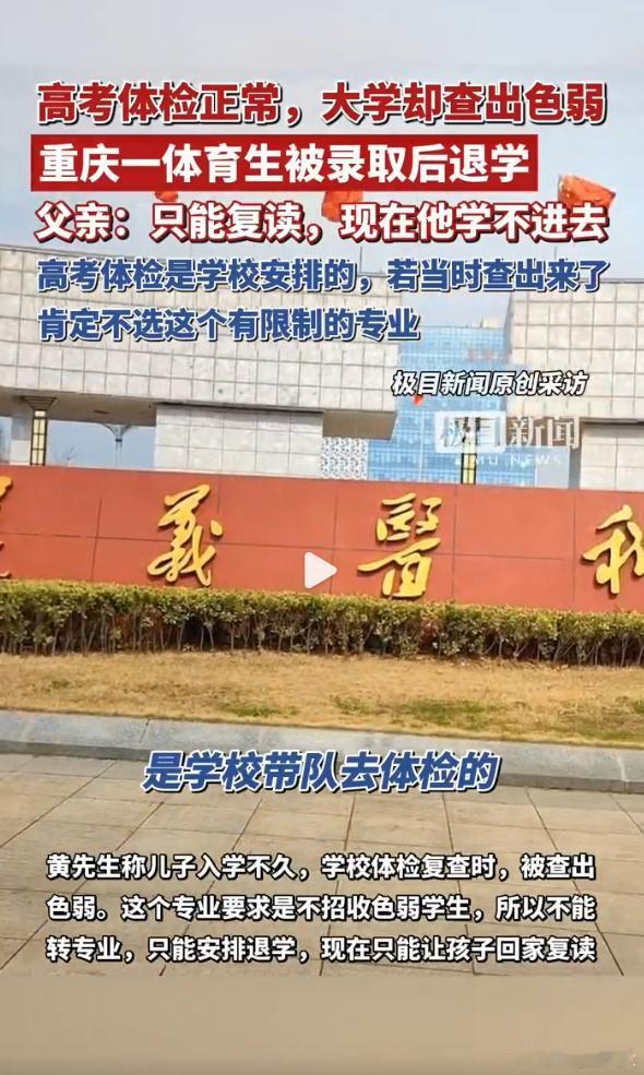 高考刚结束, 大学门还没坐热,孩子就被退学了? 重庆这位家长的心,真是彻底碎了! 儿子孙某某,体育特长生,文化502,体育87,拼了命考上遵义医科大学运动康复专业,全家都以为熬出头了。可谁能想到,开学才十来天,学校一查体检,说孩子有“色弱”,专业不收,直接取消入学资格! 可问题是——高考体检明明写着“色觉正常”啊!家长傻眼了,孩子也懵了。当时要是知道有色弱,谁敢报这个专业?可现在,孩子只能收拾行李回家,复读重来。 更气人的是,学校说按规定办事,没错;医院查出来确实有色弱,也没错。可高考体检为啥没查出来?谁来负责?打电话问教育局,没人接;问体检医院,说“不清楚”。合着一个孩子的前途,就在“没人管”三个字里,稀里糊涂毁了? 这孩子不偷不抢,分数够,体育强,拼尽全力考上大学,最后却因为一次可能漏掉的检查,被拦在门外。你说冤不冤? 规则是死的,可人是活的。能不能多一点提醒?多一条出路?而不是一句话“不符合要求”,就把人全盘否定? 这事不只是一家人的痛,而是所有普通家庭的担忧:我们拼尽全力,到底能不能拼过一次疏忽? 如果你也心疼这孩子,也怕这样的事发生在自己孩子身上,点个赞,转发一下,让更多人看到!关注我,咱一起为公平发声!体育特长生高考 艺体生高考 四川艺体生高考 儿子退学 重庆体育生复读 重庆体育升学