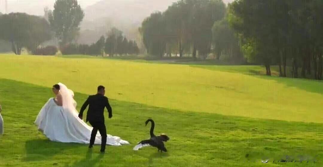 给拍婚纱照的新人发消息 新人说当时又慌又好笑 因为黑天鹅突然冲过来抢新娘 新郎说那黑天鹅立起来快一人高,翅膀拍得呼呼响,说不怕是假的,但媳妇穿着高跟鞋跑不动,只能硬着头皮拿捧花吓唬,最后把天鹅赶走。现在新娘看那被抓拍的照片,反而成了200多张成片里最宝贝的,说婚姻不就像这样,总有意料之外,一起面对,混乱也能变故事。 你说这黑天鹅哪是来抢新娘,不就是来给小两口的婚礼添个独特回忆吗?