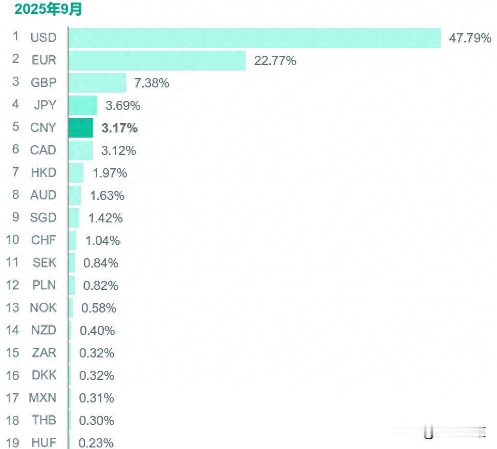 全球货币支付排名:美元涨至47.79%,欧元跌到22.77%,人民币呢 九月的报告出来了,SWIFT的,大家都在看,全球支付的数据,金额好像涨了,涨了百分之六点多吧,人民币很猛,金额激增,百分之十五点多,太夸张了。排名也升了,超了加元,第五了,占比百分之三点多,所有人都觉得她以后不得了。 美元还是老大,占比最多,百分之四十七点多,欧元第二,百分之二十二点多,差的有点远,英镑日元跟着,百分之七点多和三点多,这大家都知道,老生常谈了,可是SWIFT数据,真的准吗。 SWIFT就是个传话筒,只管发消息,钱的事儿它不管,欧元区里面自己转来转去,算了好几遍,份额肯定高啊,中国自己的支付系统呢,网银互联,CIPS,都没算进去,人民币肯定被低估了,还有被踢出去的国家,俄罗斯伊朗什么的,交易也不算,谁知道真实情况怎么样。我们的CIPS,又管发消息,又管转账,很厉害的,直接参与者好多,间接的更多,覆盖了一百多个国家,很多交易不用SWIFT,人民币实际用得更多,绝对的。 现在人民币占比,跟我们经济实力不符啊,潜力大着呢,持续开放是必须的,金融市场也要开放,人民币才能更好走出去,长期来看,人民币占比肯定会涨,但是什么时候,怎么涨,谁也说不准。