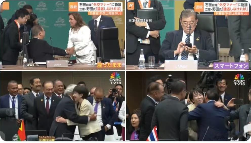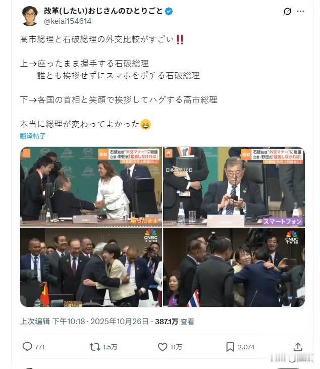 宅男VS交际花 松弛VS献媚…… 高市和石破的外交对比 石破首相坐着握手,谁也不打招呼,只顾着玩手机。 高市首相笑着与各国首脑打招呼、拥抱、牵手。 这几组对比照片在日本社交媒体上疯狂传播。