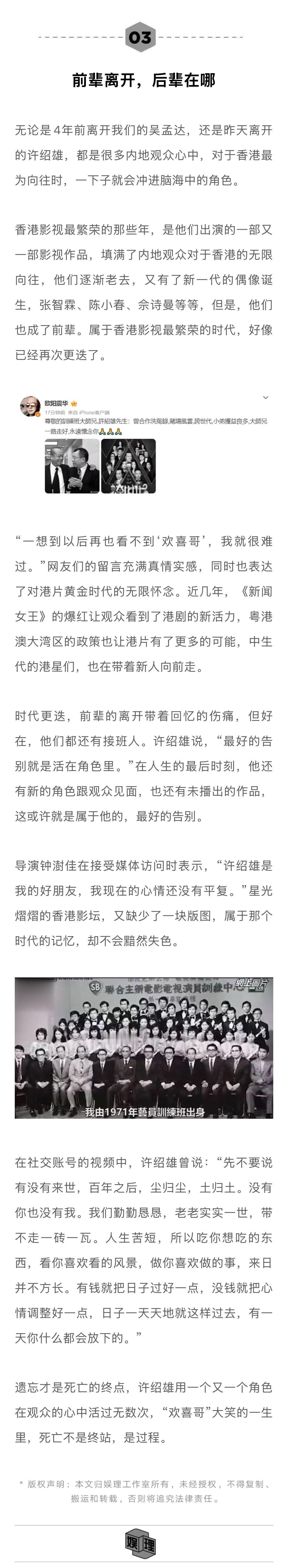 许绍雄 演到生命的最后一刻许绍雄说最好的告别是活在角色里 10月27日,佘诗曼从澳门赶回香港,去见了许绍雄最后一面。28日接受媒体访问时,佘诗曼难掩悲伤之情,“我认识他很久了,他也当我爸爸好几次,他每一次拍戏都是非常认真,也是我们的开心果,永远在片场都是很乐观,虽然大家都很累,但他还是能和我们开玩笑,他一定希望我们开开心心地活下去。”佘诗曼是许绍雄的“干女儿”,她也承诺会照顾许绍雄家人…娱理独家↓