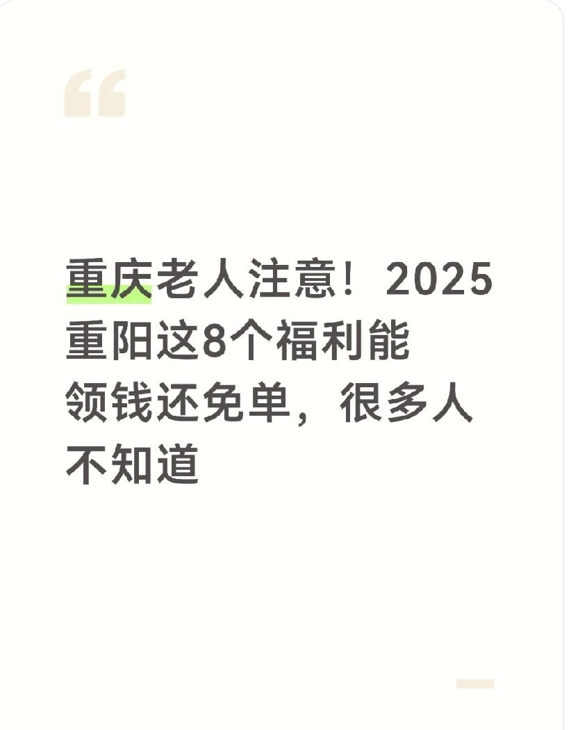 重庆老人注意!2025重阳这8个福利能领钱还免单,很多人不知道 每年重阳节,重庆都会给老人发“专属福利”,但不少人只知道能领养老金,像免费体检、公交补贴这些实用福利根本没享受到。2024年重庆的敬老福利又加了新内容,既有直接打钱的补贴,也有日常能用的免费服务,今天一条条说清楚,家里有60岁以上老人的,看完赶紧用起来。 先明确范围:重庆这些福利覆盖所有户籍老人,部分福利非户籍老人满足条件也能领,不用扎堆去社区跑手续,很多在家用手机就能办,这点特别方便。 1. 高龄津贴:满80岁每月有钱拿,年龄越大给越多 这是最实在的“现金福利”,不用申请,系统会自动核对年龄打钱。60-79岁老人暂时没有,但80岁以上就能领:80-89岁每月100元,90-99岁每月200元,100岁以上每月1000元。比如家住渝中区的张爷爷82岁,每个月10号左右钱就自动进社保卡,一年能多1200元,买米面油刚好够。 注意:如果老人没收到,先查社保卡有没有激活金融功能,去发卡银行柜台就能办,激活后次月就能补发。 2. 养老服务补贴:失能老人每月能领500元,还能换免费护理 家里有失能、半失能老人的,这个补贴一定要申请。重庆户籍、60岁以上,经鉴定为失能或半失能的老人,每月能领500元养老服务补贴,这笔钱可以直接打给护理员,也能在定点养老机构抵护理费。 3. 公交地铁免费:65岁以上刷身份证就能坐,不用办卡 以前老人坐公交要办“敬老卡”,现在不用麻烦了。65岁以上重庆户籍老人,直接刷身份证就能免费坐市区所有公交、地铁,包括轻轨1-9号线和环线。非户籍老人只要在重庆住满1年,办个《居住证》,刷居住证也能免费坐。 上周带邻居王婆婆去解放碑,刷身份证直接过闸机,特别方便。提醒一下,坐跨区长途公交(比如去江津、璧山的),只免市区内的路段费用,超出部分要自己掏钱。 4. 免费体检:每年1次,还能上门服务 65岁以上老人,每年能免费做1次基础体检,项目很全:血常规、尿常规、肝肾功能、B超、心电图都包含,连血压血糖监测也是免费的。社区卫生服务中心会提前打电话通知,行动不方便的老人,还能预约上门体检,不用家人专门请假陪同。 去年我帮外婆预约了上门体检,医生不仅给做了检查,还教了怎么测血压、怎么调降糖药,最后还送了一本健康手册,上面记着下次体检时间和注意事项,特别贴心。 5. 公园景区免门票:50多个景点随便玩,包括5A景区 重庆很多热门景点对老人免门票,像洪崖洞(一层观景台)、磁器口古镇、鹅岭二厂、园博园这些,65岁以上老人刷身份证就能进。5A景区比如武隆仙女山、南川金佛山,65岁以上免门票,只需要付景区内的观光车费。 上个月我带父母去仙女山,老爸刷身份证直接免了120元门票,老妈没满65岁,买半票花了60元,比平时划算不少。注意:部分景区在节假日会限流,最好提前在景区公众号上预约。 6. 白内障手术免费:医保全报,还补贴交通费 家里有老人得白内障的,不用心疼钱。重庆户籍60岁以上老人,做白内障手术,医保能100%报销,包括手术费、晶体费和住院费。如果是农村老人,去县城或市区医院做手术,还能申请200-500元的交通费补贴,去社区医保办就能申请。 我老家亲戚张叔去年做了白内障手术,总共花了8000多,医保全报了,还领了300元交通费补贴,自己一分钱没花,现在看东西特别清楚。 7. 老年食堂补贴:一顿饭10块钱,还能送餐上门 重庆很多社区开了“老年食堂”,60岁以上老人去吃,每顿只要10-15元,两荤一素一汤,米饭随便添。行动不方便的老人,打电话就能预约送餐上门,送餐费只要2元。 比如渝北区龙溪街道的老年食堂,每天中午有红烧肉、清蒸鱼这些硬菜,我外婆经常去吃,说比自己在家做方便,还能和老邻居聊天。非户籍老人只要有《居住证》,也能享受这个价格。 8. 法律咨询免费:每周有律师进社区,能写遗嘱、调纠纷 很多老人担心养老钱被骗,或者不知道怎么立遗嘱,现在社区每周都有律师坐班,免费提供法律咨询。不管是财产分配、遗嘱起草,还是邻里纠纷、消费维权,都能找律师帮忙,不用花钱找律所。 我邻居李爷爷之前想立遗嘱,去社区找律师咨询,律师不仅帮他梳理了财产情况,还免费帮他写了遗嘱,最后还联系公证处做了公证,全程没花一分钱。 其实重庆还有很多针对老人的福利,比如图书馆借书免押金、药店买药能刷医保报销90%以上,只是很多人没留意。这些福利不用托关系、不用走后门,只要符合条件就能领,家里有老人的,赶紧对照看看有没有漏领的。 最后想问,你家里的老人用过这些福利吗?有没有遇到过申请流程麻烦的情况?或者你还知道重庆哪些敬老福利?欢迎在评论区分享,让更多老人能享受到这些实惠。