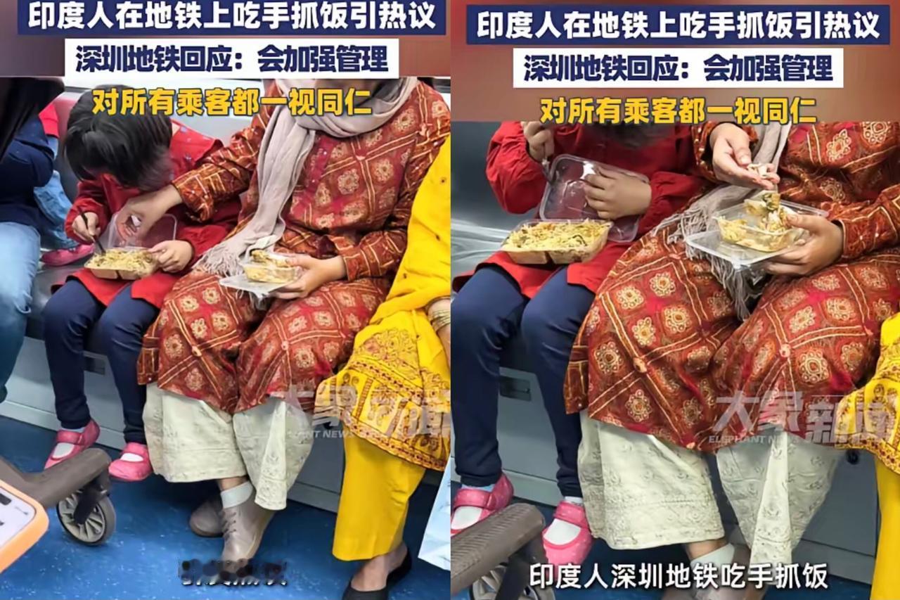“滚回自己国家” 确实没必要, 但深圳地铁里印度人当着众人面吃 手抓饭,换谁看了不闹心? 公共场合的规矩,总不能因为是外国人就“网开一面”吧? 安全员前脚走,这俩人后脚就掏饭出来吃,乘客好心提醒还不当回事——到底是没听懂,还是故意无视规则? 地铁里空间密闭,饭味儿一散,周围人多难受? 而且吃完的垃圾、掉的饭粒,不还得让工作人员收拾? 这真不是“哪国人”的问题,就是没把公共规则放在眼里。 地铁站说要加强巡查、一视同仁,这话听着靠谱,但光靠巡查盯着也不是长久办法。 规则要想立住,既得有人及时管,更得让所有人打从心里觉得“公共场合就得守规矩”。 不然今天有人钻空子,明天说不定就有更多人跟着学。 不管是本地人还是外国人,进了同一个公共场所,就得守同一个规矩。 你们觉得,除了多巡查,还能咋做让大家打心底里愿意遵守地铁里的规矩?印度人加拿大