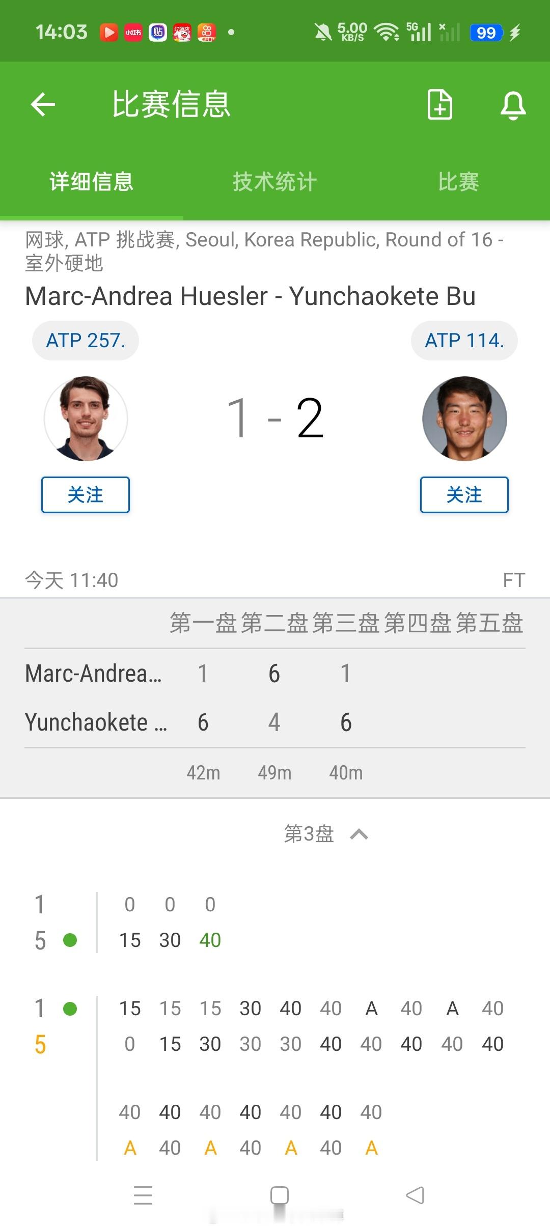 小花小草资讯[超话] 【韩国挑战赛】男单正赛第二轮:2号种子布云朝克特6-14-66-1击败🇨🇭球员许斯勒晋级八强