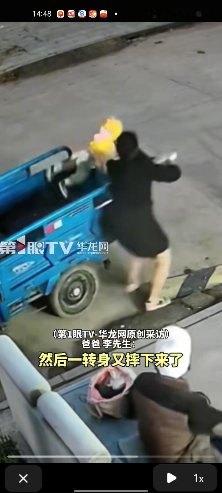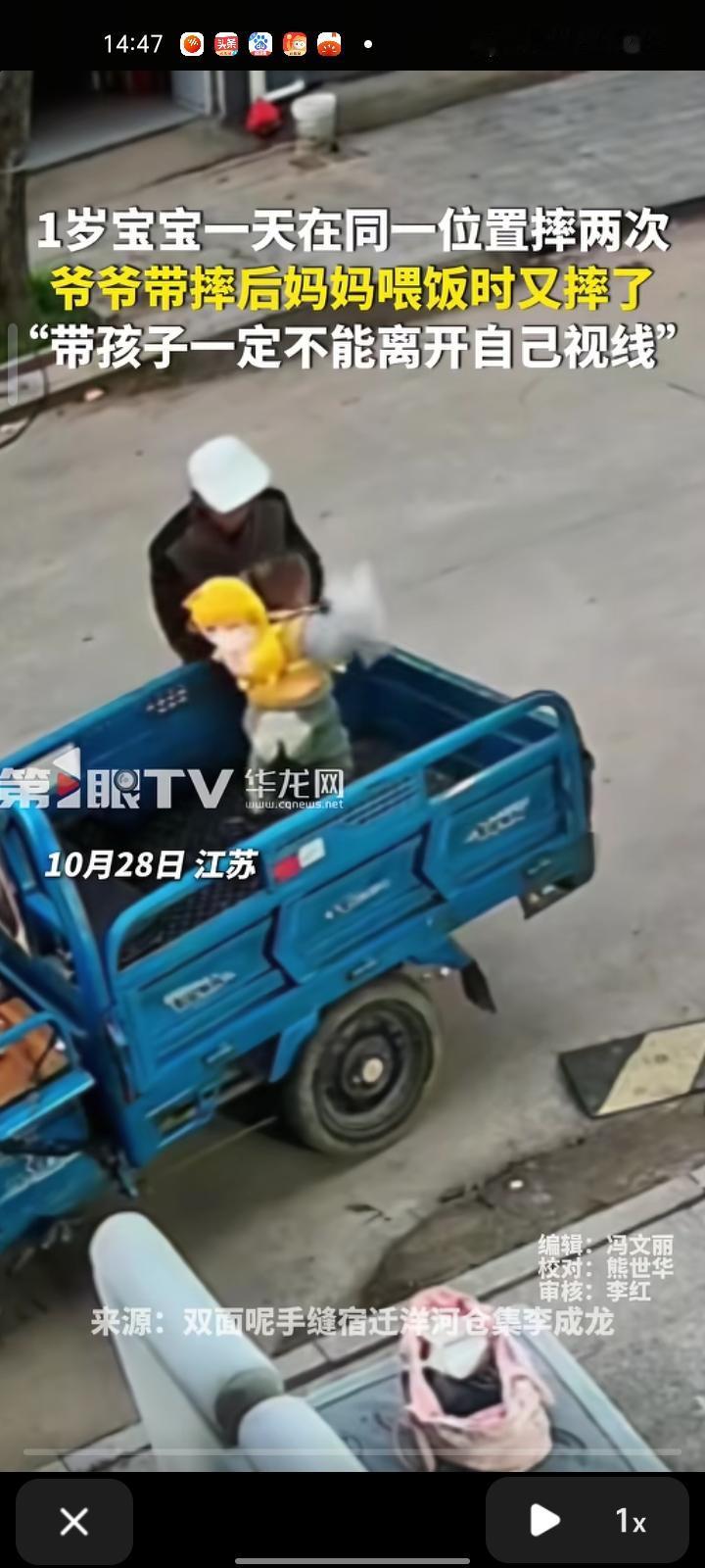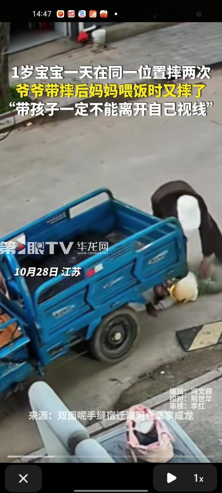 10月28日,江苏宿迁。11个月大的宝宝在同一位置连摔三次,爷爷带摔后,妈妈喂饭时宝宝又摔了,孩子爸爸看了令人揪心。他表示,带孩子一定不要离开自己的视线,一定不能在高空中玩耍。