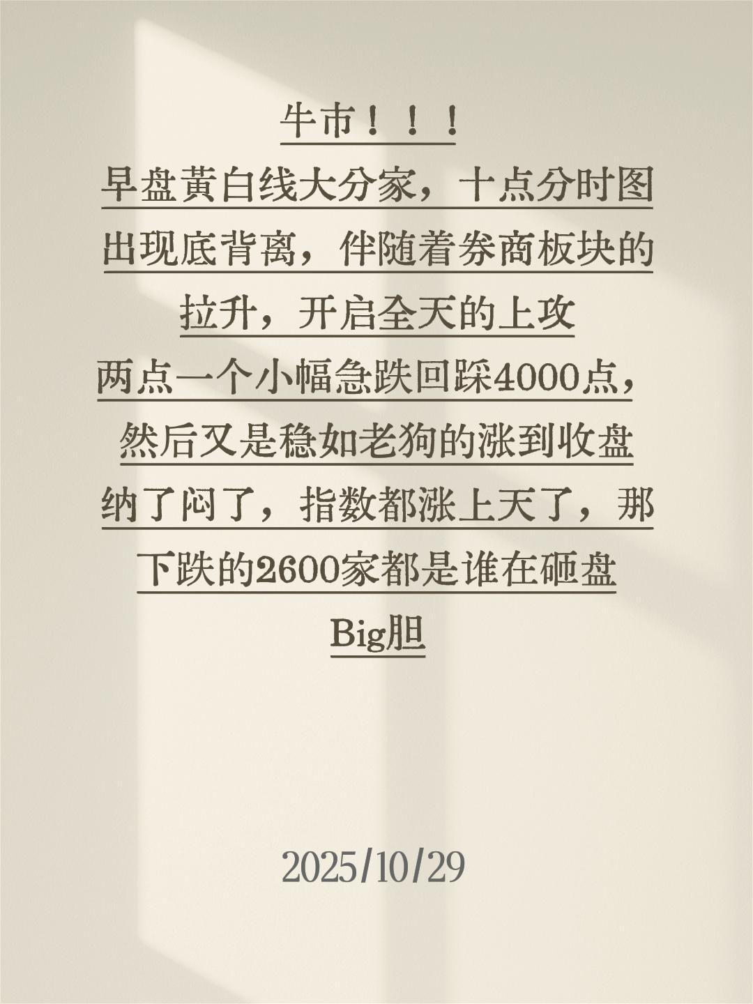 牛市!!! 早盘黄白线大分家,十点分时图出现底背离,伴随着券商板块的拉升,开启全天的上攻 两点一个小幅急跌回踩4000点,然后又是稳如老狗的涨到收盘 纳了闷了,指数都涨上天了,那下跌的2600家都是谁在砸盘 Big胆 创作灵感 证劵