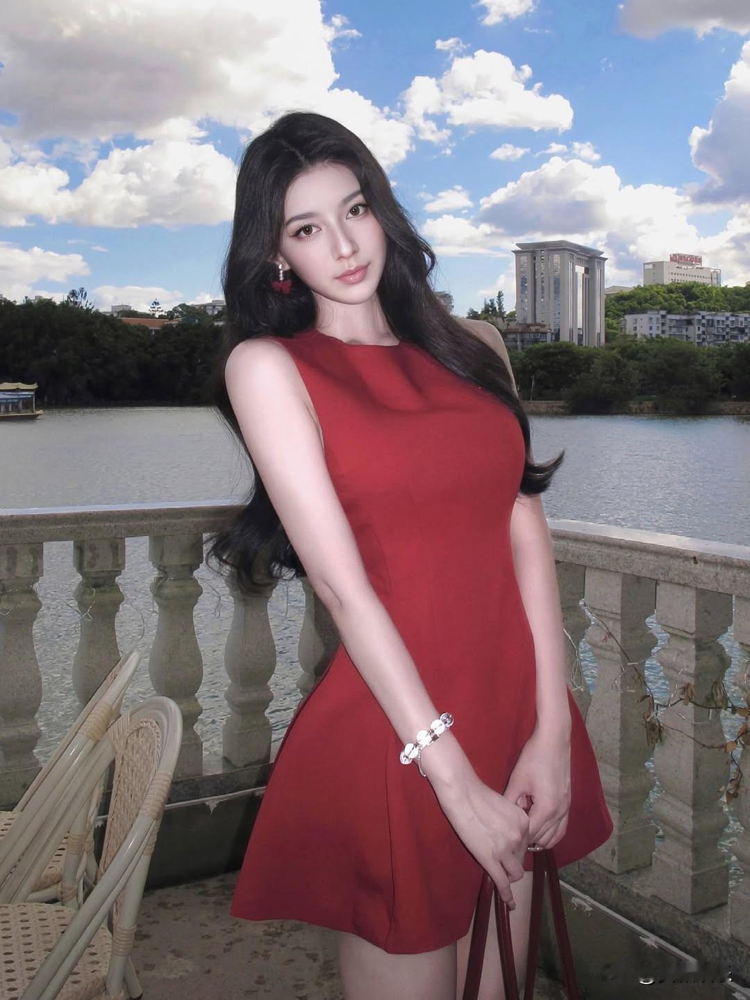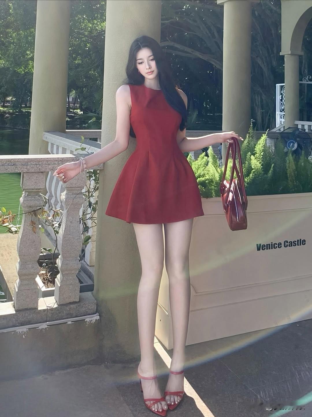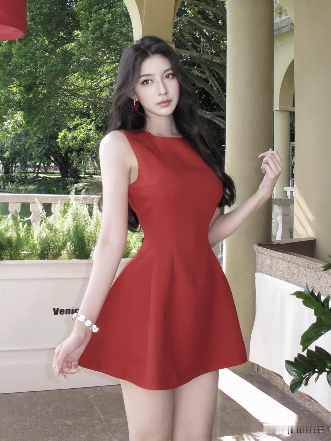 夏日红裙,优雅迷人,绿意盎然背景下的时尚穿搭漂亮小姐姐 大长腿