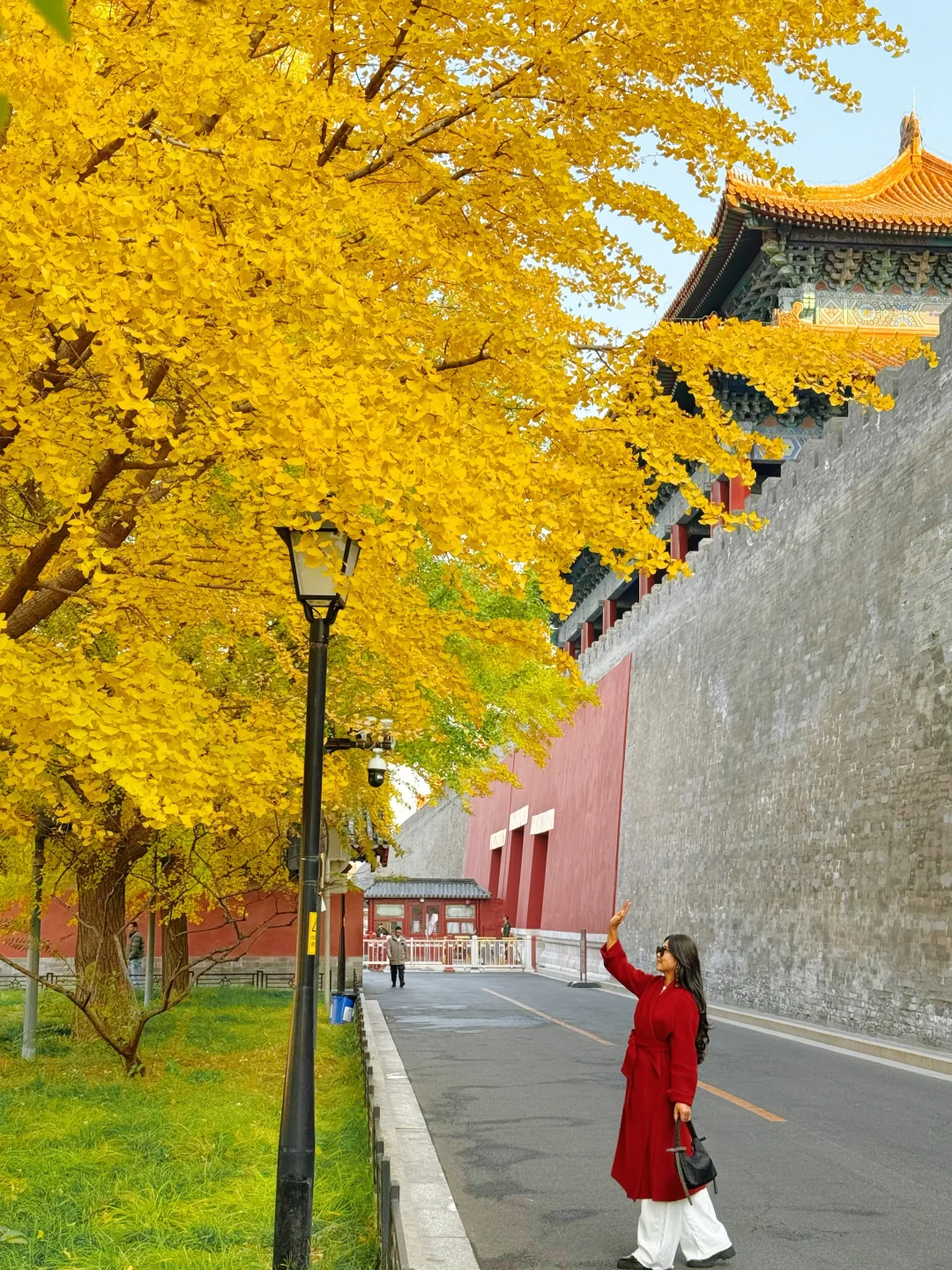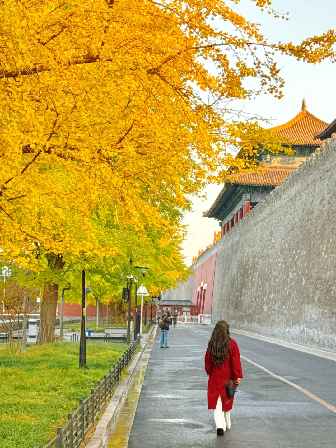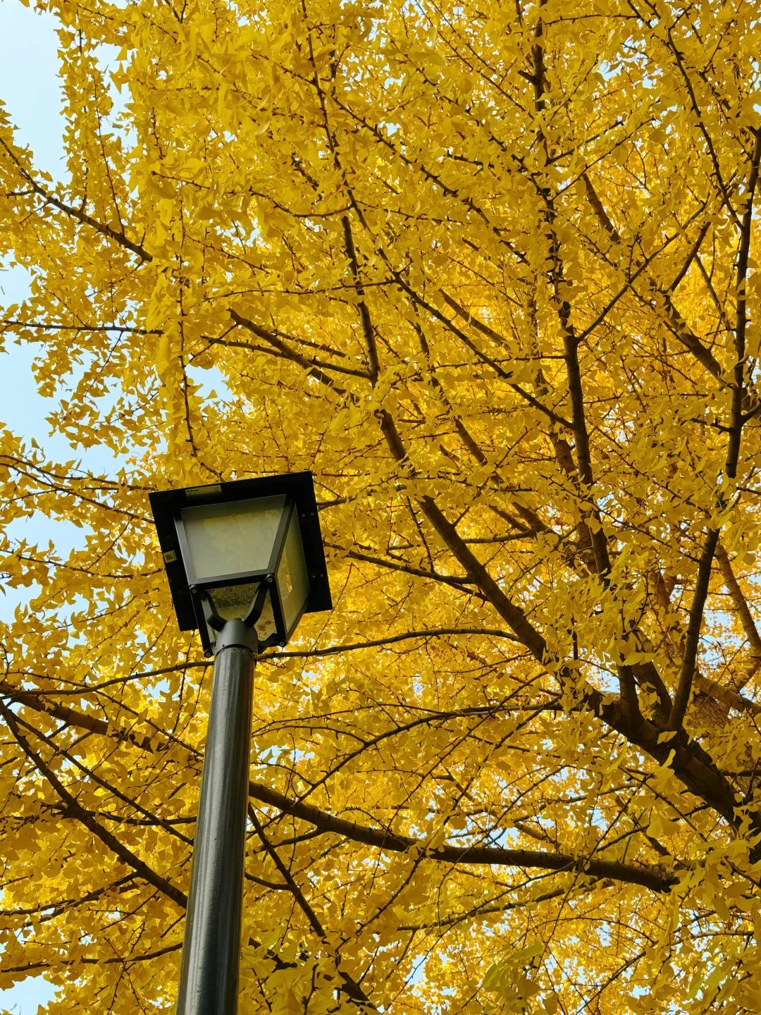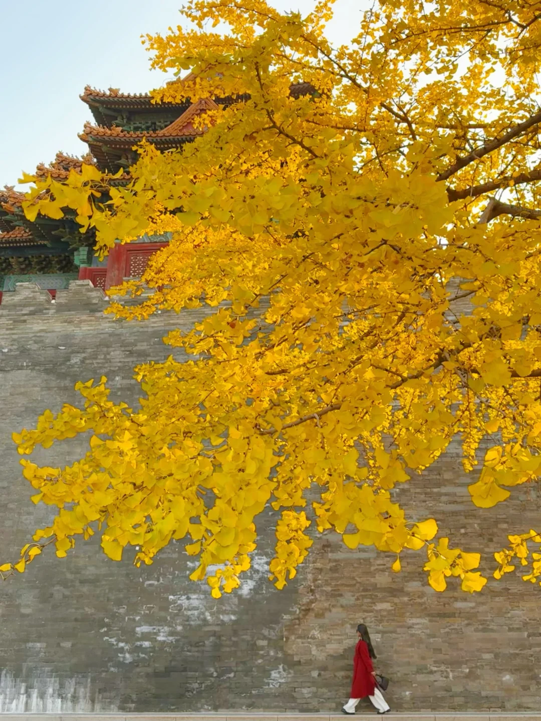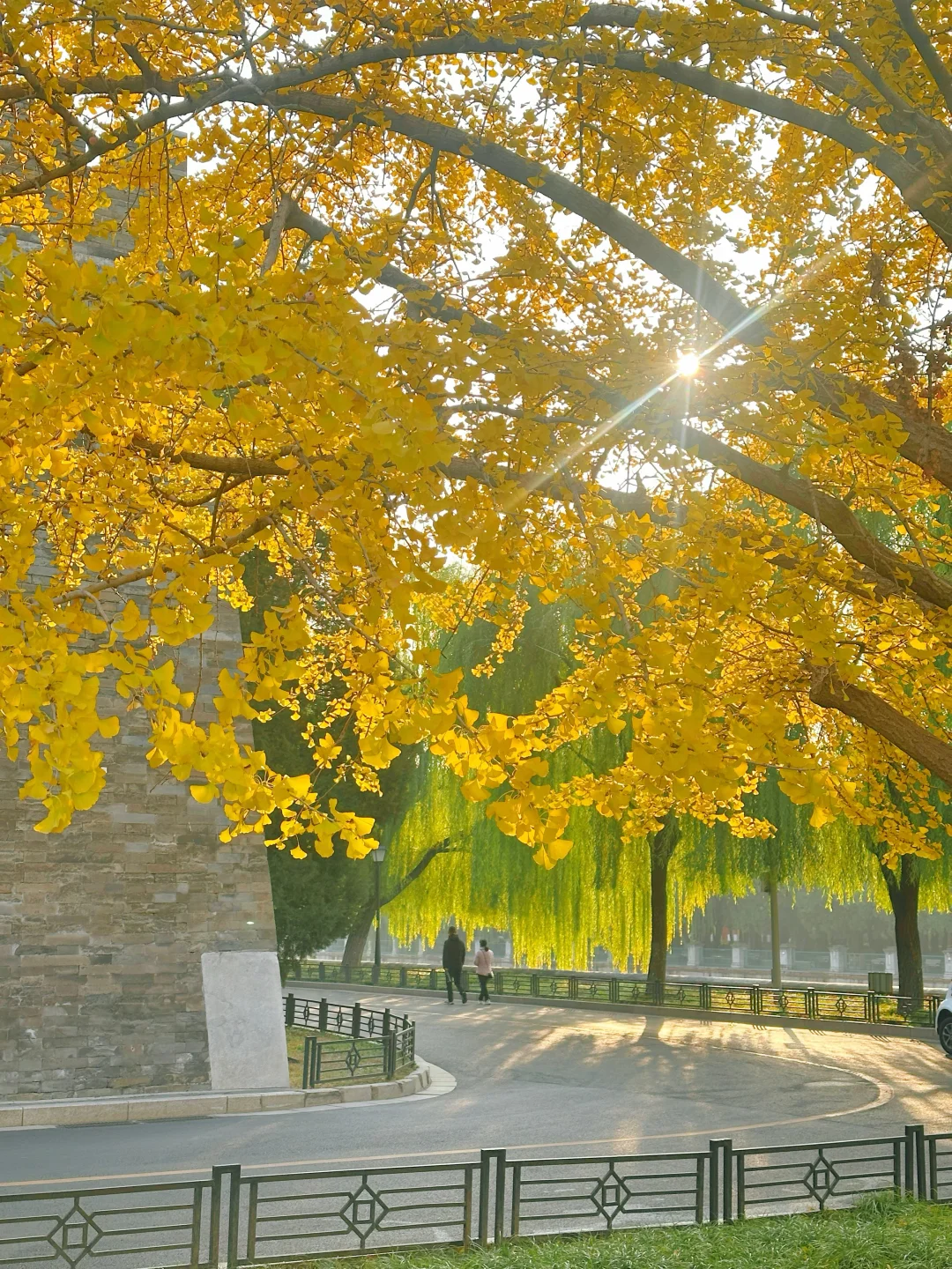 目前有四五颗银杏树已经黄透,其余的还是绿色,趁人少快去拍