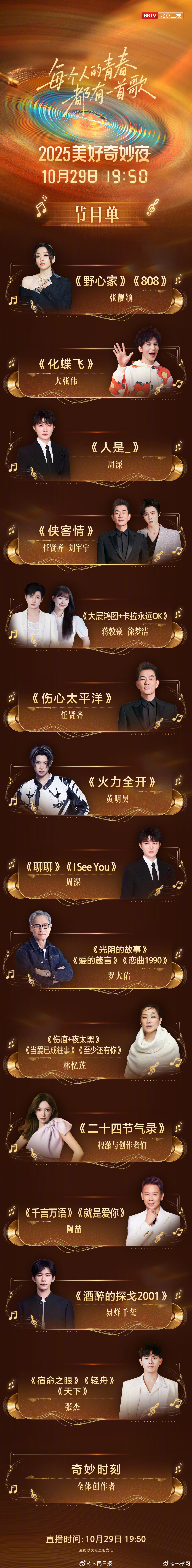 【来了!#刘宇宁周深将亮相北京卫视美好奇妙夜#】《人是_》 、《醉酒的探戈2001》、黄明昊《火力全开》、《天下》……发布#美好奇妙夜节目单#,你最期待谁?(人民日报)