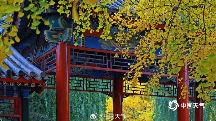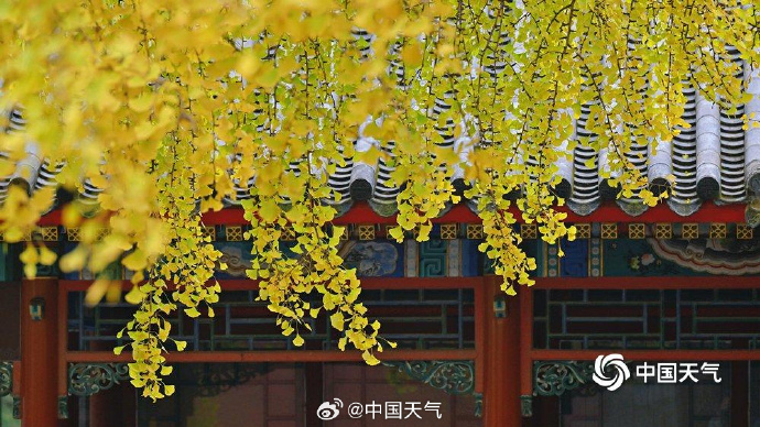 【绝美!#打卡中山公园秋日视觉盛宴#】#银杏长廊下的中式建筑美学# 近日,北京中山公园银杏“上妆”,金黄色叶片与中式建筑同框,尽显典雅与意境之美。 (中国天气)