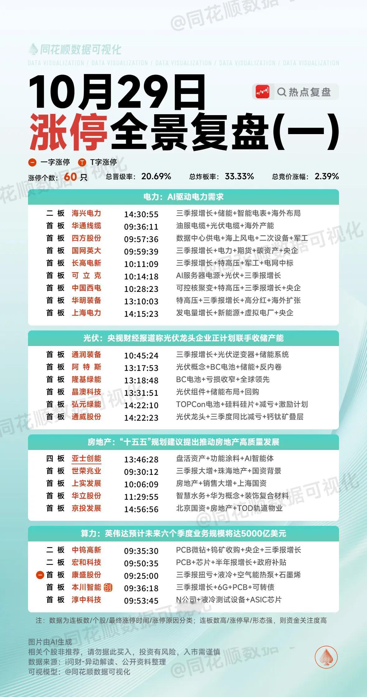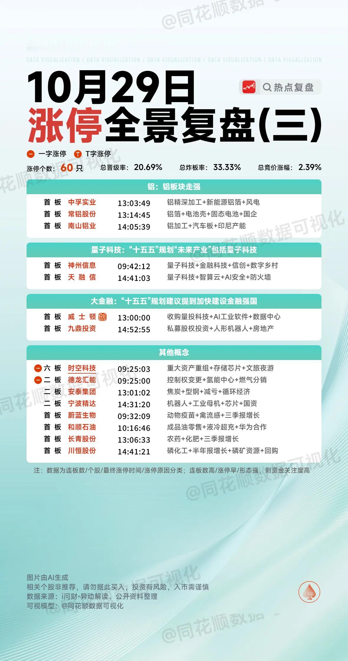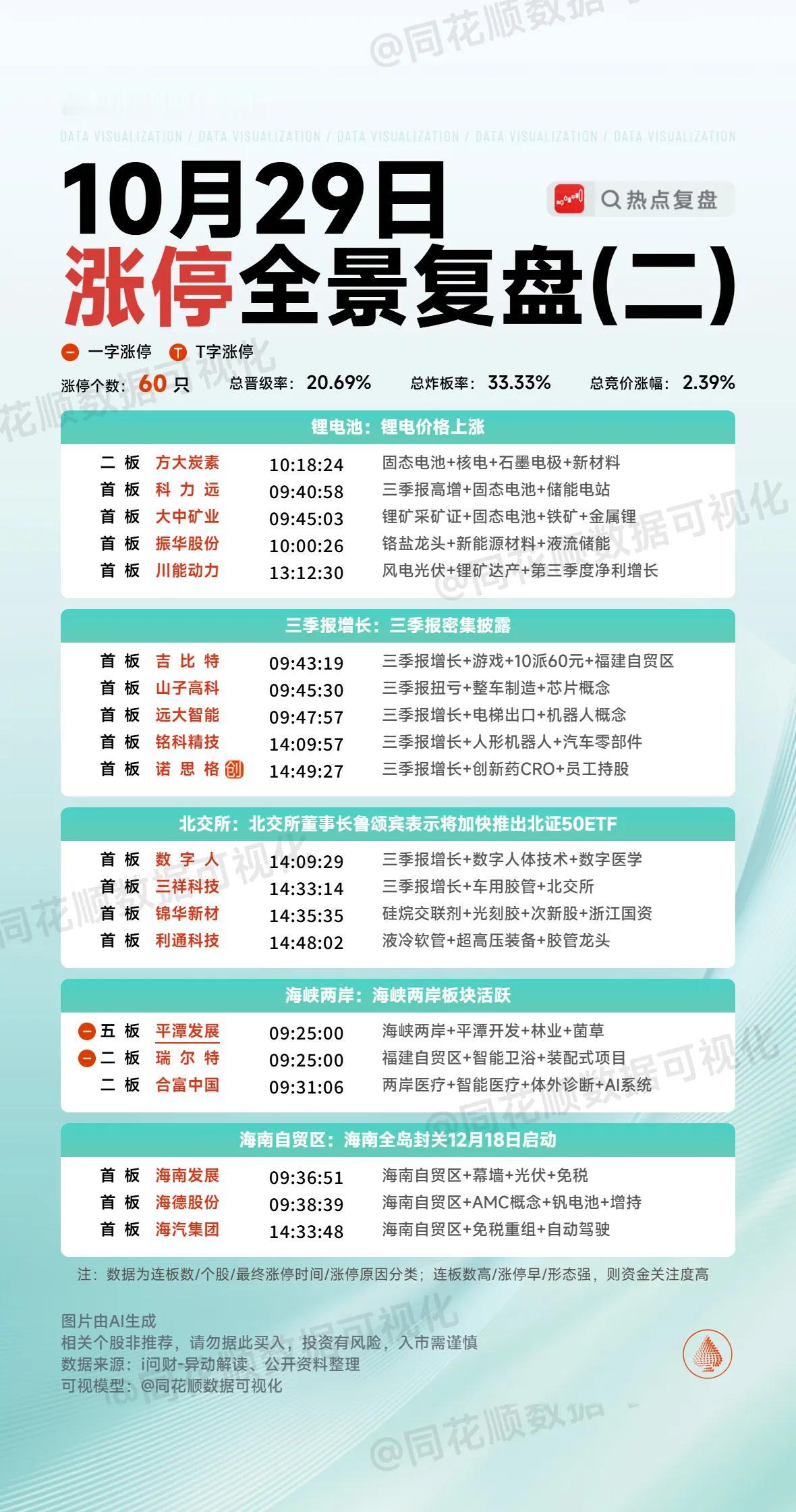 10月29日复盘:山子高科、平潭发展、中钨高新、神州信息、方大炭素隔日走势的一些看法! 1、山子高科(业绩) 山子今天这么强势的表现跟昨晚盘后公布的三季度报业绩息息相关,因为它净利润是4.37亿,而去年同期亏损13.64亿,虽然它中报净利润是2.18亿,三季度是有好的预期,但是从三季度报看,它整个3季度就有2.19亿的利润,相当于上半年的总和,这样的业绩就是明显超预期的,所以开盘竞价的表现是非常认可的,特别是竞价最后阶段抢筹到近6个点高开,开盘后迅速有资金承接去封板,但是它毕竟是深调到底部的个股,板上出现了明显的自己砸盘,好在很快出现承接回封,走出了一个底部比较漂亮的首板! 盘后的龙虎榜新闸路、云锦路、章盟主、中山东路4个游资席位都是大幅买入,买盘还有一个机构席位,卖盘东财席位居多,这是一个非常不错的榜单,再结合山子是回调比较充分的首板,隔日肯定有比较高的冲高溢价,虽然今天介入的资金大部分是短线情绪资金,但是山子之前有着良好的人气和股性,所以隔日一旦竞价走出强势表现,出现资金去承接连板的概率还是比较大的,所以虽然这只个股流通盘偏大,但是不排除市场合力做多的情况下它能走出连板! 2、平潭发展(海峡两岸) 平潭竞价再次出现强势缩量一字板,但是很明显今天后排多只个股走出了冲高兑现的走势,所以市场对于这个方向就是典型的短炒,那么隔日平潭分歧放量就再正常不过了,从今天海峡方向的整体情绪来看,隔日平潭竞价直接开板的概率是非常大的,那么它竞价的强度就比较值得关注了,一旦继续有4个点以上的高开,那么开盘后资金方向的选择非常重要,虽然它已经3个一字板,但是它的人气和盈新是不可同日而语的,所以开盘后会不会有资金去承接上板还是非常值得关注的,如果海峡方向同时出现修复,平潭走出放量换手板就更值得期待了,不过这只个股的接力最好同时参考时空的强度,如果时空出现明显的兑现断板,平潭可能也会有所影响,那么它的接力就不是很适合了,总之,平潭的放量换手值得博弈,但是客观条件是非常多的,并不是想当然的上! 3、中钨高新(PCB+业绩) 中钨在周末公布业绩后,它在周一是个明显的炸板形态,但是之后一个交易日出现了明显的高开确认强势,并且走出了一个趋势放量的首板,今天早盘竞价6个多点的高开再次确认强势,再加上PCB方向有明显的持续性,中钨开盘就有资金去强势封板,但是这只个股毕竟算是大盘股,板上分歧还是非常大的,好在今天大盘情绪给力,它最终还是在强势承接下走出连板! 盘后的龙虎榜广发金融中心买入1.3亿,江苏路和方新侠买入也超5千万,3日榜上江苏路净买入达到了1.6亿,卖盘多为做T的机构量化和获利止盈的资金,整个榜单算是比较不错的良性换手,隔日继续冲高问题不大,但是中钨想要继续连板也确实不是很现实,毕竟这只个股流通盘很大,连续走出了近3个板的高度,获利资金止盈撤退肯定会越来越多,从近期市场的表现看,这种盘子的个股很难在这个位置继续去继续做成连板,所以中钨接下来的趋势形态可能更值得关注,总之,这只个股隔日大概率会有高溢价,但是想要连板可能会非常困难,除非整个市场再次放出非常大的量能! 4、神州信息(量子科技) 早盘竞价最后阶段,神州出现明显的跳空高开,开盘后就是明显的做多强势拉升表现,并且很快出现资金大单封死涨停,走出了一个比较强势的缩量N型上攻板! 盘后的龙虎榜新闸路买入近8千万,量化西大街买入6千万,东大名路和另外一个量化也是打板买入,卖盘整体的抛压并不大,神州这个榜单是非常强势的,考虑到它在这一波量子科技爆发初期一度是辨识度最高的个股,可惜那次1进2失败,使得它一直弱于格尔和达华,今天达华因为短线情绪没有走出来,而昨天烂板的格尔最终也是板上兑现炸板,神州反而成了这个方向绝对的龙头,而且今天在板块其余个股纷纷兑现时,它并没有出现明显抛压,很明显在之前几个交易日把筹码振干净了,隔日就有更强势的预期,对于这只个股来说,隔日早盘竞价的表现非常关键,如果足够强,那么它或许会在达华断板后继续带动整个量子科技走出来,那么隔日它板上的分歧承接放量板依然值得关注! 5、方大炭素(锂电) 方大竞价4个点的高开还是比较强势的,但是早盘因为连板情绪低迷,它走出了明显的冲高回落,但是它回调到早盘低点后突然出现资金强势拉升直线涨停,并且直接出现11亿的大封单,直到尾盘也没有出现开板放量,走出了一个明显的放量连板走势! 盘后的龙虎榜成都系早盘兑现后在板上再次接回来,买盘还有两个游资两个量化,卖盘多为量化止盈或做T,整个榜单算是良性换手,成都系在早盘情绪不佳时兑现离场,在后面出现板块和个股共振拉升时又买回来就说明它是受资金认可的,隔日的预期就会很高,一旦竞价有资金引导,它是很有可能走出来的! 文中的内容仅为分享和交流,不作为实际操作建议!