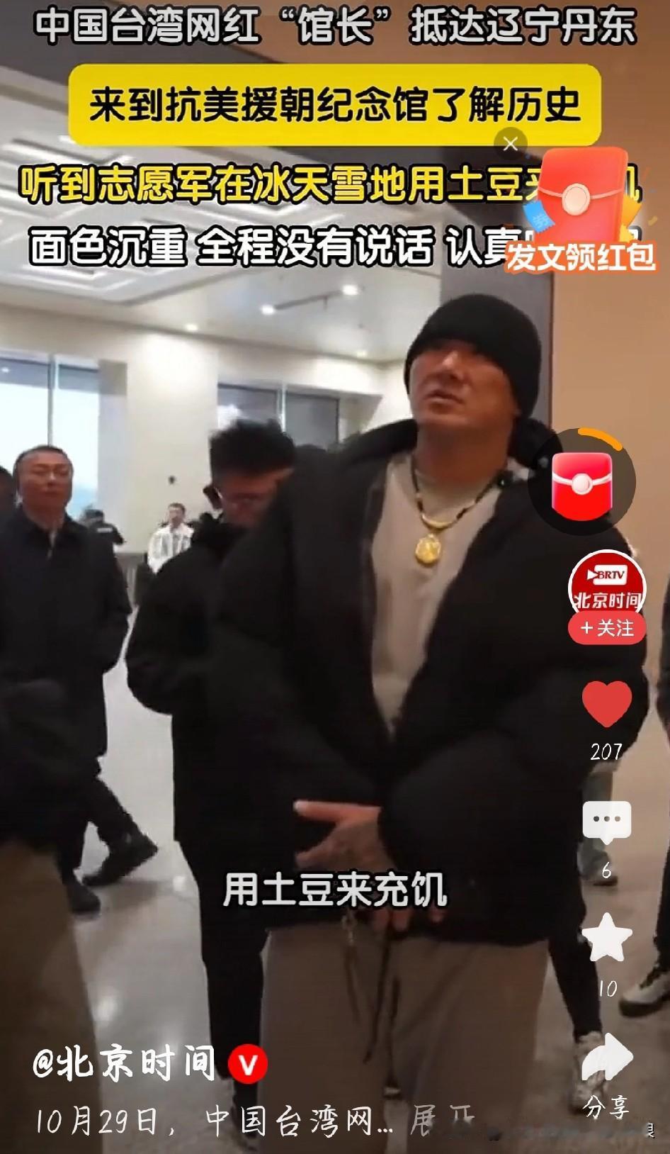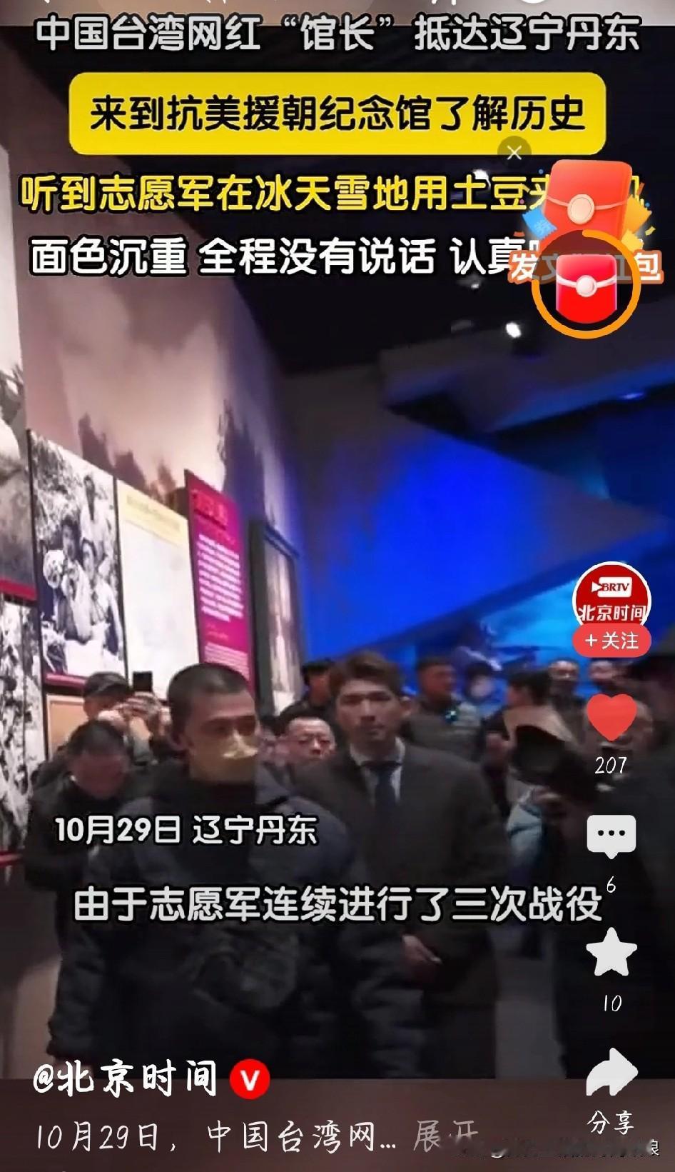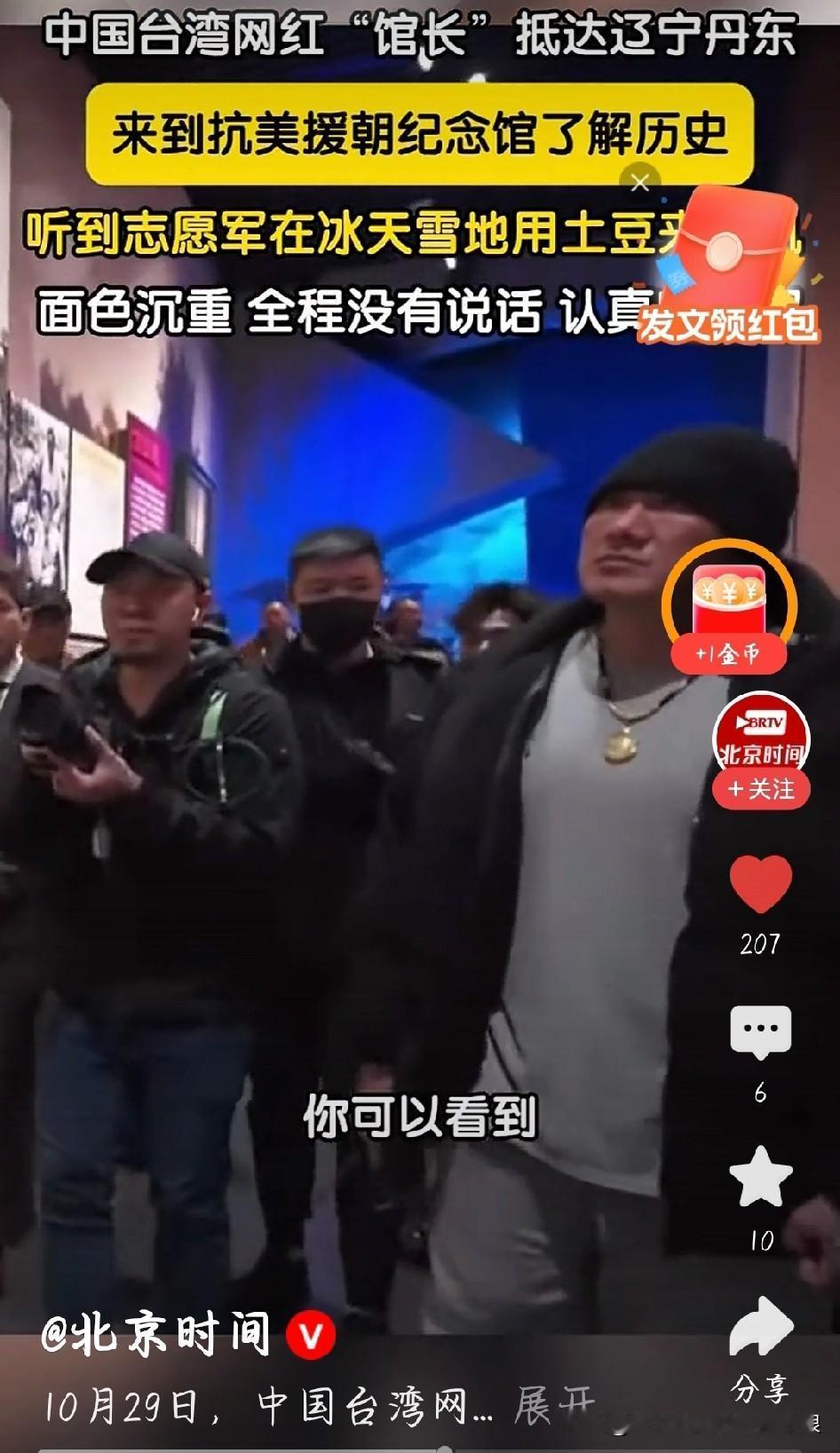 台湾馆长逛抗美援朝纪念馆,一句话戳中人心! 台湾网红馆长今天去丹东逛抗美援朝纪念馆了,刚到地方就被丹东市民围住,大家扯着嗓子喊“馆长加油,14亿中国人挺你”,场面太热血了。 他边看边感慨,当年武器、国力差那么多,先辈们在零下三四十度的地方还能打赢,现在咱们中国更强了,中国人就该更骄傲自信。其实他来这儿早有打算,因为民进党把这些历史从台湾教材里拿掉了,他就是想亲自看看,再把真实历史带回台湾讲给年轻人听。 要知道,馆长之前就因为说“我是中国人”,10亿新台币的产业都被打压了,但他还是敢站出来说两岸势必统一。这种敢讲真话、认祖归宗的劲儿,难怪大家都挺他。 历史从不是课本上的字,是刻在骨子里的根。为馆长这份勇气点个赞!馆长访大陆 台湾省馆长