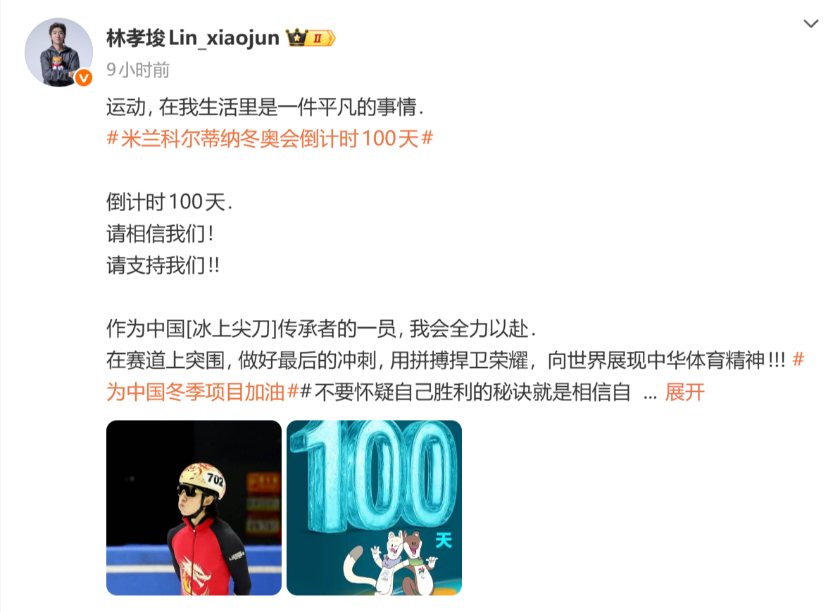 #林孝埈发博说要用拼搏捍卫荣耀#【#林孝埈说要向世界展现中华体育精神#】#米兰冬奥会100天倒计时# 中国短道速滑运动员发博:作为中国“冰上尖刀”传承者的一员,会全力以赴,在赛道上突围,做好最后的冲刺,用拼搏捍卫荣耀,向世界展现中华体育精神。
