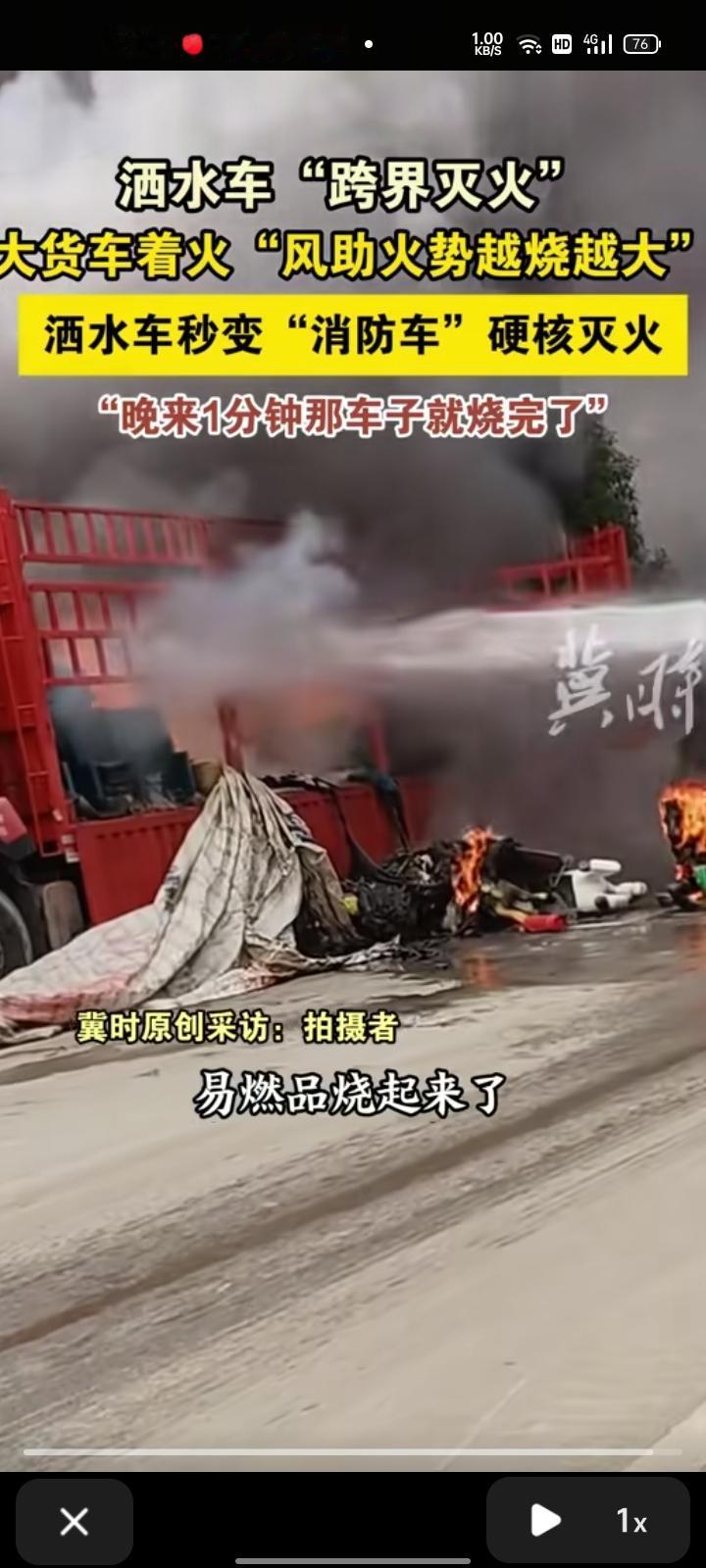 10月27日,宜春高安市。网友发视频称,赶集卖百货的大货车着火,旁边人不敢去救也救不了。这时,一辆路过的洒水车帮忙扑灭。大货车车厢可能装有易燃品什么的,可能是做早饭导致易燃品烧起来了。