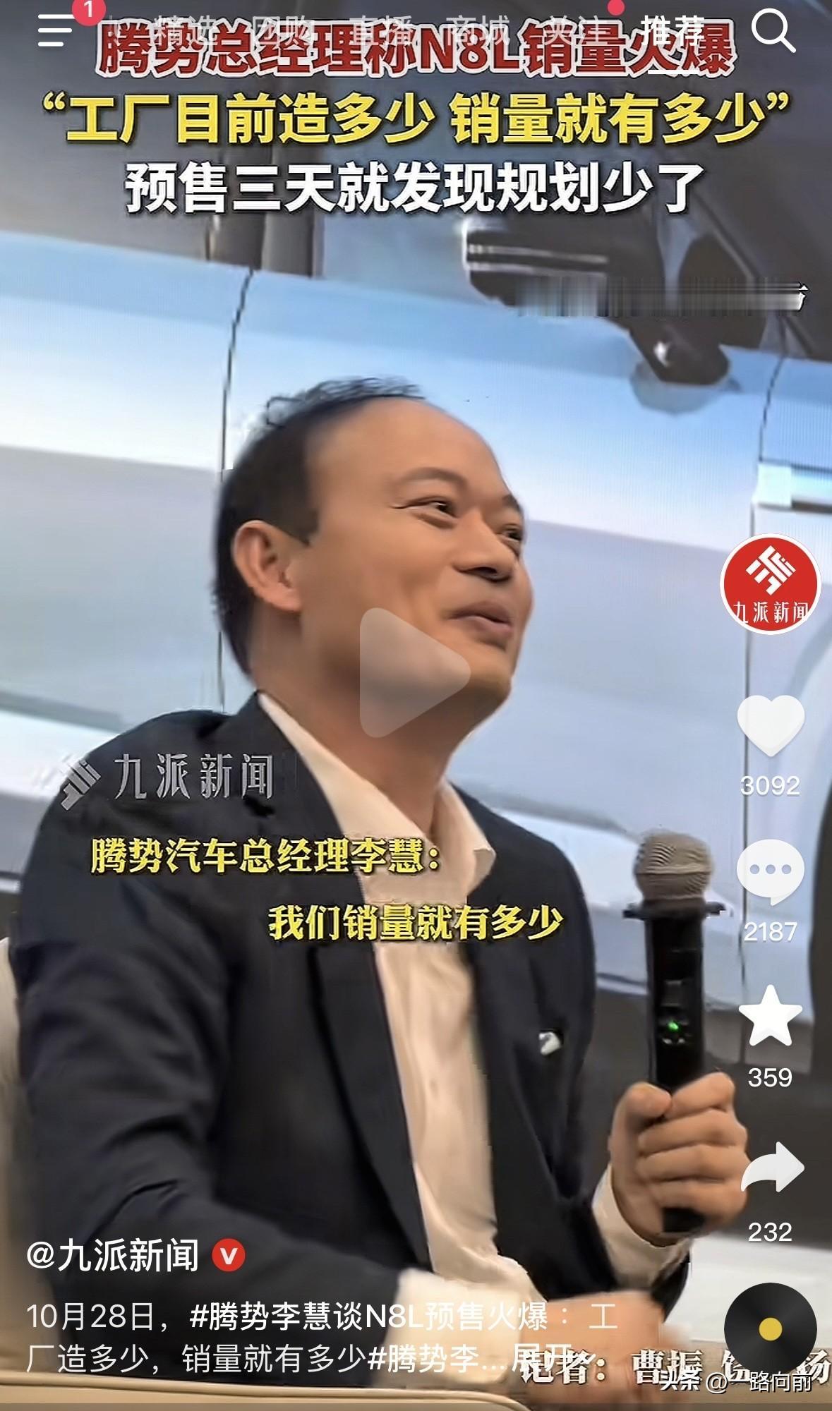 腾势总经理李慧直接坦言:“腾势N8L现在根本不愁卖,销量全看工厂能造多少,造多少就能卖多少!” 新车刚上市服务器就被挤爆,加了10倍服务器还扛不住,逼得他连夜催工厂24小时三班倒赶工,这火爆程度简直颠覆认知! 能让消费者抢着订、厂家急着造,腾势N8L到底藏着什么“杀手锏”?说白了就是把“性价比”和“用户痛点”捏得太准了。 首先价格就直接掀了市场底牌。正式上市价29.98万起,比预售价直降2万,硬生生把大六座豪华SUV的门槛拉到30万以内。要知道同级的理想L8、问界M8起售价都得32万往上,这差价直接给消费者省出了好几年的油钱,难怪网友说“比亚迪一出手,价格战就没法打了”。 更绝的是“低价不减配”,配置堆得比同价位竞品厚太多。安全上有“易三方技术”兜底,高速避让不侧翻、180km/h爆胎都不失控,车身用的2千兆帕热成钢焊,安全感直接拉满。空间更是戳中家用刚需,5.2米的车长配3075mm轴距,三排全是电动座椅,第三排不仅能前后滑动100mm,还带加热功能,彻底解决了“第三排是小板凳”的尴尬。 连大车难开的痛点都解决了。3.9秒破百的性能,搭配4.58米的极小转弯半径,还有蟹行模式和圆规调头,不少女性车主试驾完都直呼“灵活得不像大车”。再加上全系标配的云辇-A空气悬架、11升车载冰箱、后排吸顶屏这些配置,30万级的价格能买到50万级的体验,谁能不动心? 其实从数据就能看出有多火:预售首周订单就突破2万台,有的门店一天能接17个订单,这还是没算上上市后新增的量。李慧急着催产能不是作秀,毕竟现在订车已经要等两个月,要是交付周期再拉长,很可能让用户转投竞品怀抱,这波“甜蜜的烦恼”确实得赶紧解决。 说真的,腾势N8L的爆火绝非偶然。以前腾势靠D9撑销量,受众相对单一,现在N8L精准切中家庭用户需求,用“低价+满配+安全”的组合拳打破市场平衡。这背后既有比亚迪的技术兜底,也有对用户需求的精准洞察,难怪能让消费者抢着下单。 不过网友也有顾虑:“产能跟不上会不会搞饥饿营销?”“交付快了品控能保证吗?” 但不管怎么说,能让厂家急着扩产的车,至少说明产品力是真的硬。