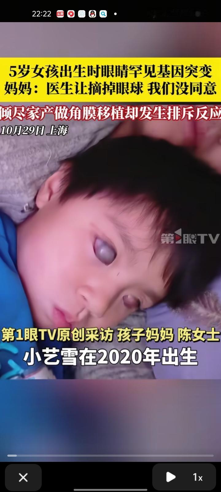 10月29日,上海。孩子妈妈陈女士称,2020年出生的女孩眼睛没有发育好,出现罕见的基因突变——葡萄肿,视力只能看到一点点影子。医生建议把孩子的眼球摘掉,但没同意,就换了一家医院做眼角膜移植手术,半个月后突然开始排斥,又回到原来的样子。 早在2021年,陈女士带着孩子做手术,前前后后手术费花了六万元,目前陈女士准备带女孩去北京继续治疗。