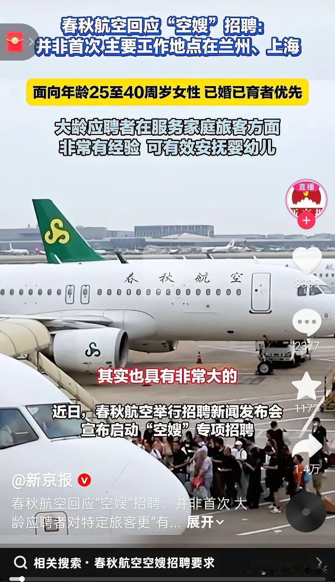 因为在坐飞机的时候,经常有一些婴幼儿喜欢闹腾,喜欢哭闹,对于那些空姐来说,很多没有结婚,没有哺育婴幼儿的经验,所以说很多人的话根本无法掌控局面,会引起乘客的投诉,于是春秋航空就开始招聘已婚已育的空乘小姐,我觉得这是一个很大的创新,因为在国内的大部分航空公司,他们招收的都是未婚的,但其实在国外的话,很多空姐空少都是老头老太太,就是长相没有说像国内的那么年轻青春靓丽,这是与国内航空公司用人的不同,之前郑强教授还吐槽有很多国外的空姐根本就是太太,你坐飞机时不好意思让老太太不停的帮你端茶倒水,反而是因为国内的空姐都比较漂亮,所以说很多人要求他一会喝茶,一会又倒饮料之类的!