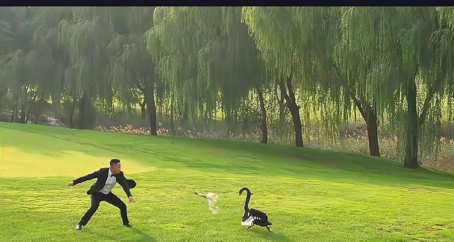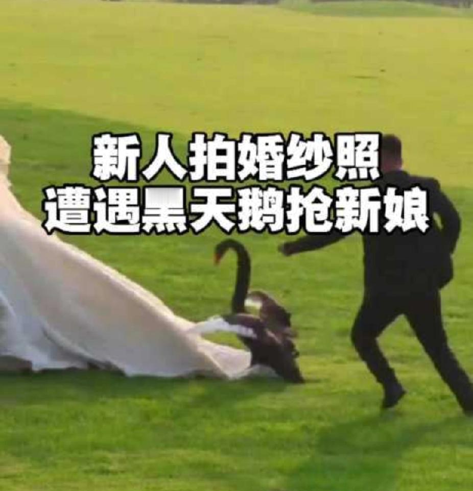10月27日,山东济南一对新人在拍摄婚纱照时,意外遭遇“黑天鹅抢新娘”,新郎如何应对这一突发情况? 10月27日下午,山东济南的一对新人在长清区一处草坪拍摄婚纱照时,一只黑天鹅被新娘的白色婚纱所吸引,追逐新娘。新郎孙先生立即上前,用手中手捧花将黑天鹅驱离。这一意外场景被摄影团队记录下来,发布在网络社交平台后迅速走红,引发网友热议。网友纷纷表示,这一意外比摆拍更具纪念意义,并有人将新人与黑天鹅制作成AI图片送上祝福。黑天鹅美图