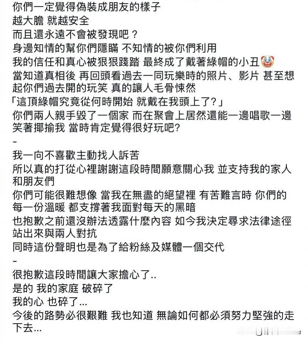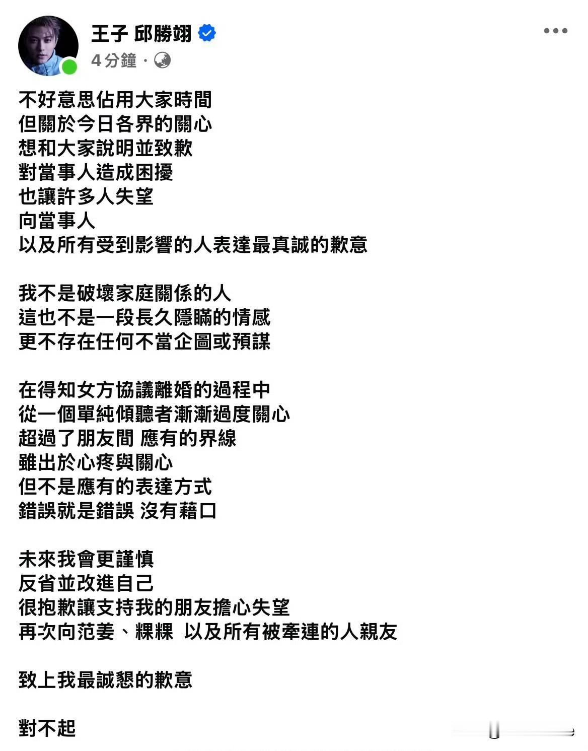 10月29日,王子塌了,鬼鬼撇清两人关系,我的古早鬼王cp竟然就这样be了!?! 看到他被女方老公公开指控后发的道歉声明就很无语,承认与女方的关系,否认是破坏家庭的人,把自己说成是心软的男人…… 说这么多,是想让大家同情他么?关心别人关心到过界……未来会更加谨慎,原以为他不结婚是没遇到真爱,结果他是爱太多…… 脑海里响起一首歌,那就这样吧…… 《黑糖玛奇朵》,再见了!!!