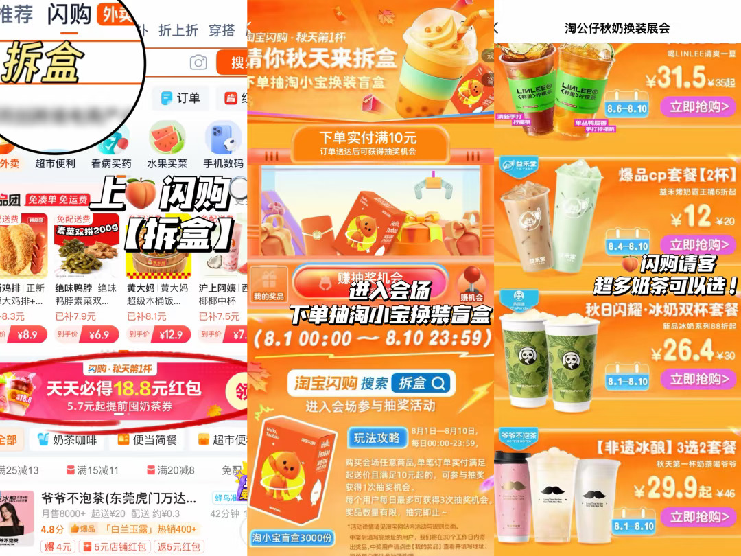 而且这次还有新福利新玩法!?8月1日-8月10日上🍑闪购🔍【拆盒】下单还能抽淘小宝换装盲盒!!还有机会拿秋游周边和淘小宝同款娃衣🥹这谁能忍住