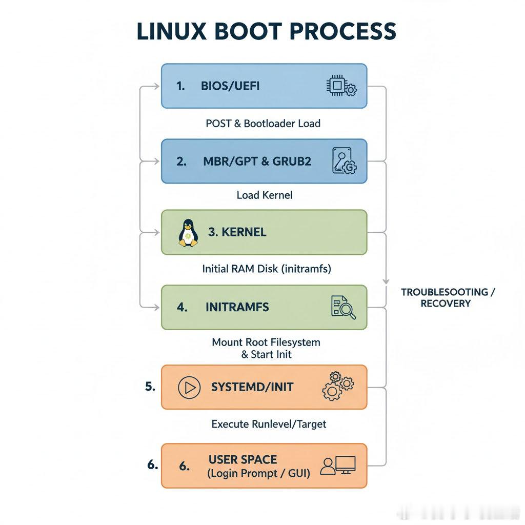 这个流程体现了Linux从硬件到用户层的严密协作,每一步都至关重要。理解它有助于深入掌握Linux系统管理和故障排查。